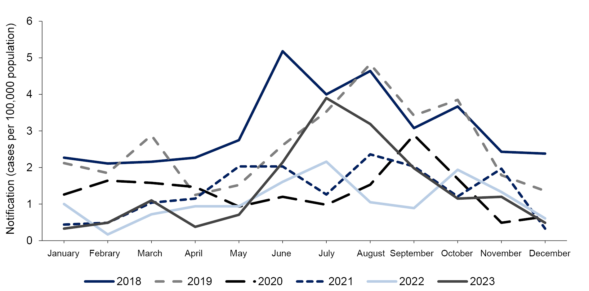 Fig. 3. Monthly dynamics of salmonellosis incidence in Primorsky Krai from 2018 to 2023.