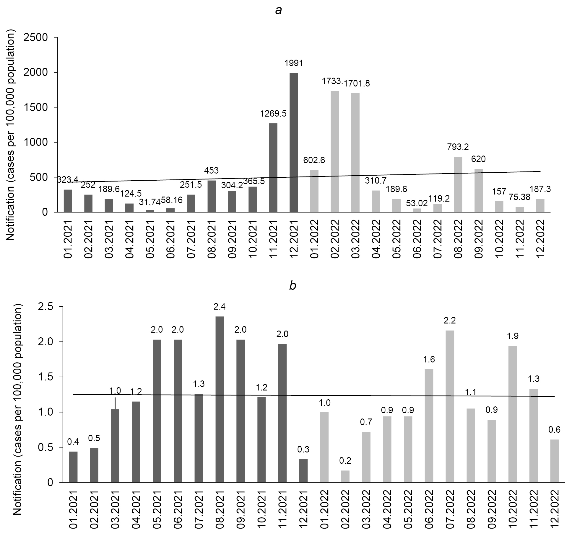 Fig. 4. Comparative analysis of the monthly dynamics of COVID-19 (a) and salmonellosis (b) incidence from 2021 to 2022.