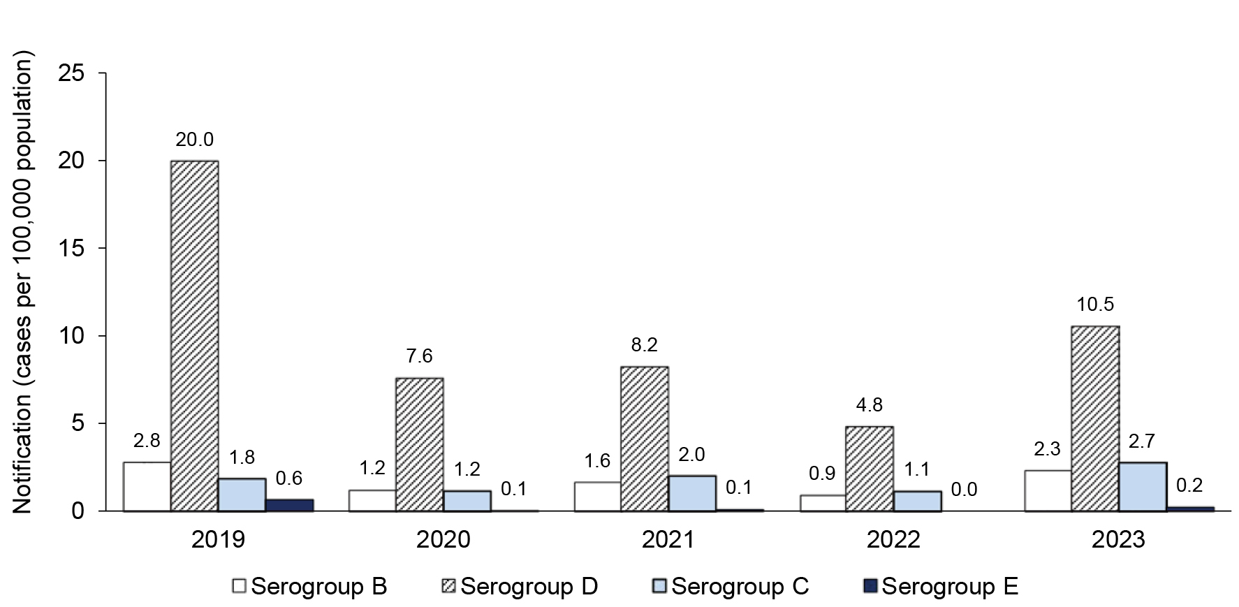 Fig. 5. Dynamics of the incidence of the population with individual serogroups of Salmonella enterica in Primorsky Krai from 2019 to 2023.