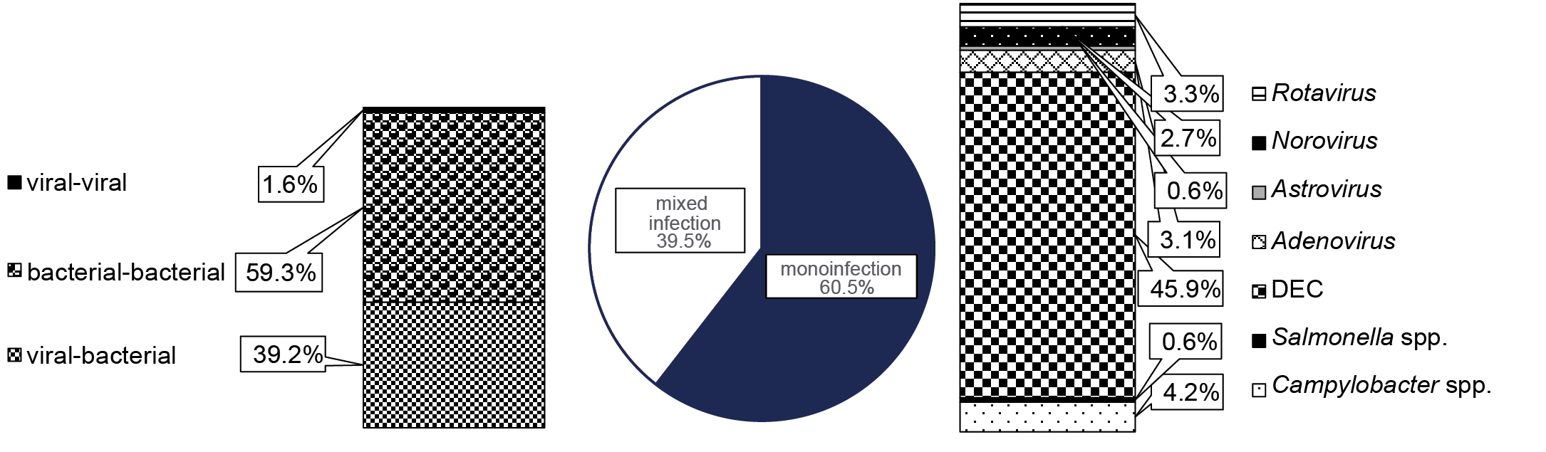 DNA of bacterial pathogens was detected in 355 (74.1%; 95% CI 70.1–77.8%) samples, of which Campylobacter spp. accounted for 9.8% (95% CI 7.5–12.9%), Salmonella spp. for 1.9% (95% CI 1.0–3.5%), and DEC for 62.4% (95% CI 57.9–66.7%). Viral pathogens accounted for 25.1% (95% CI 22.2–30.0%), of which Adenovirus accounted for 10.2% (95% CI 7.8–13.3%), Rotavirus for 6.9% (95% CI 4.9–9.5%), Norovirus for 6.7% (95% CI 4.8–9.3%), and Astrovirus for 2.1% (95% CI 1.1–3.8%).