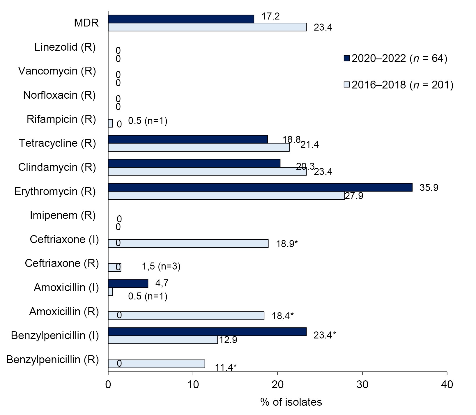 Note. *For benzylpenicillin, the percentage of resistant isolates (R), as well as susceptible at increased exposure isolates (I), is indicated.