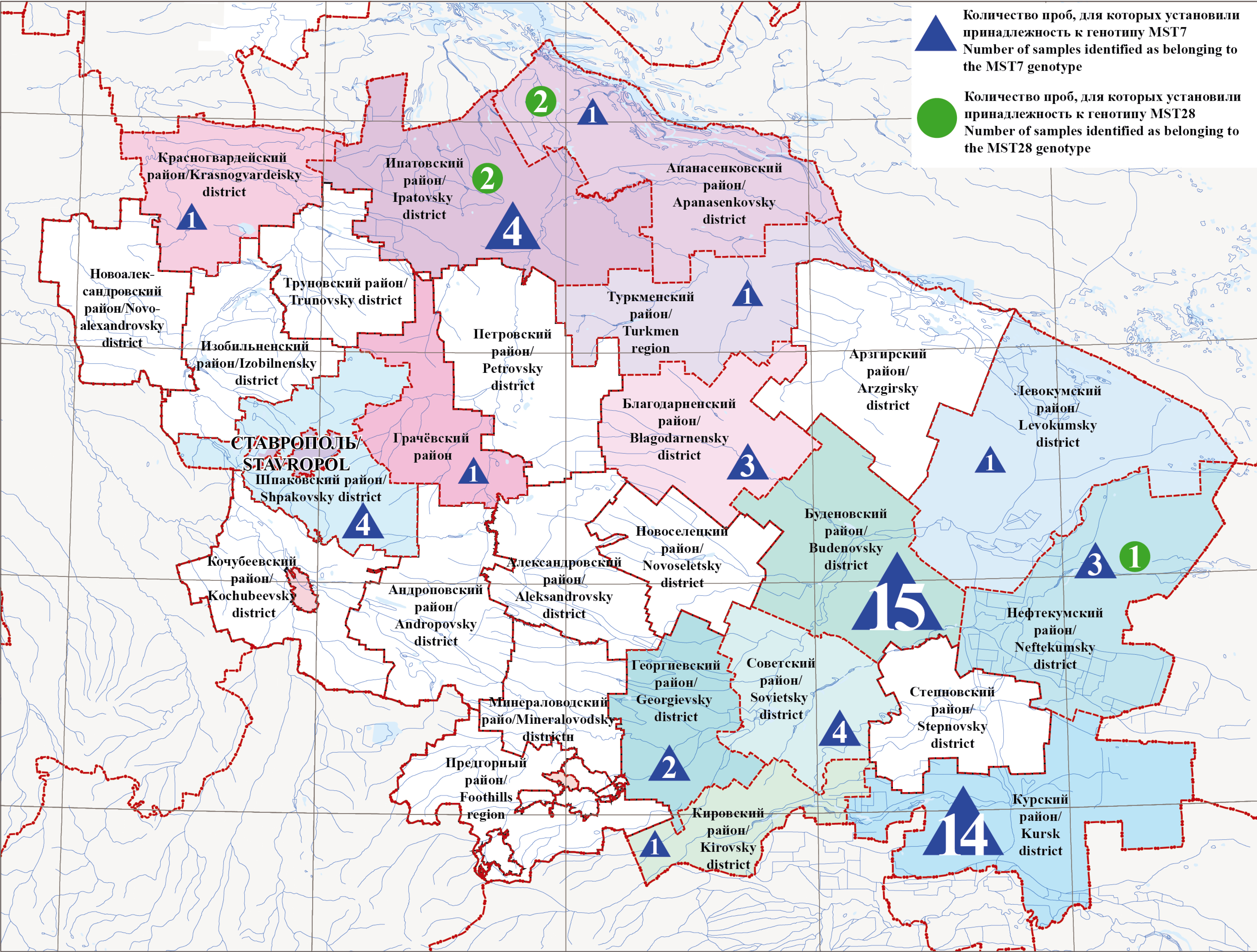 Fig. 1. Geographical distribution of C. burnetii MST genotypes in Stavropol Territory (2009–2023).