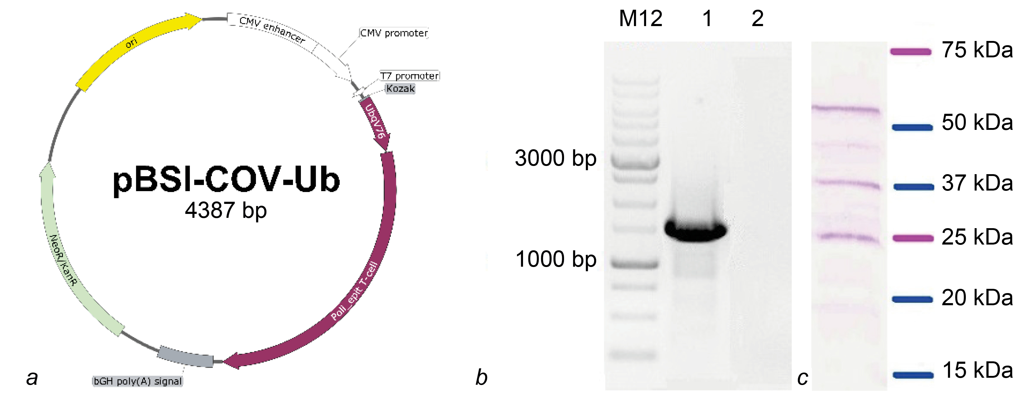 Fig. 2. Structure of plasmid pBSI-CoV-Ub (a) and target gene expression analysis after transfection of HEK293T cells.