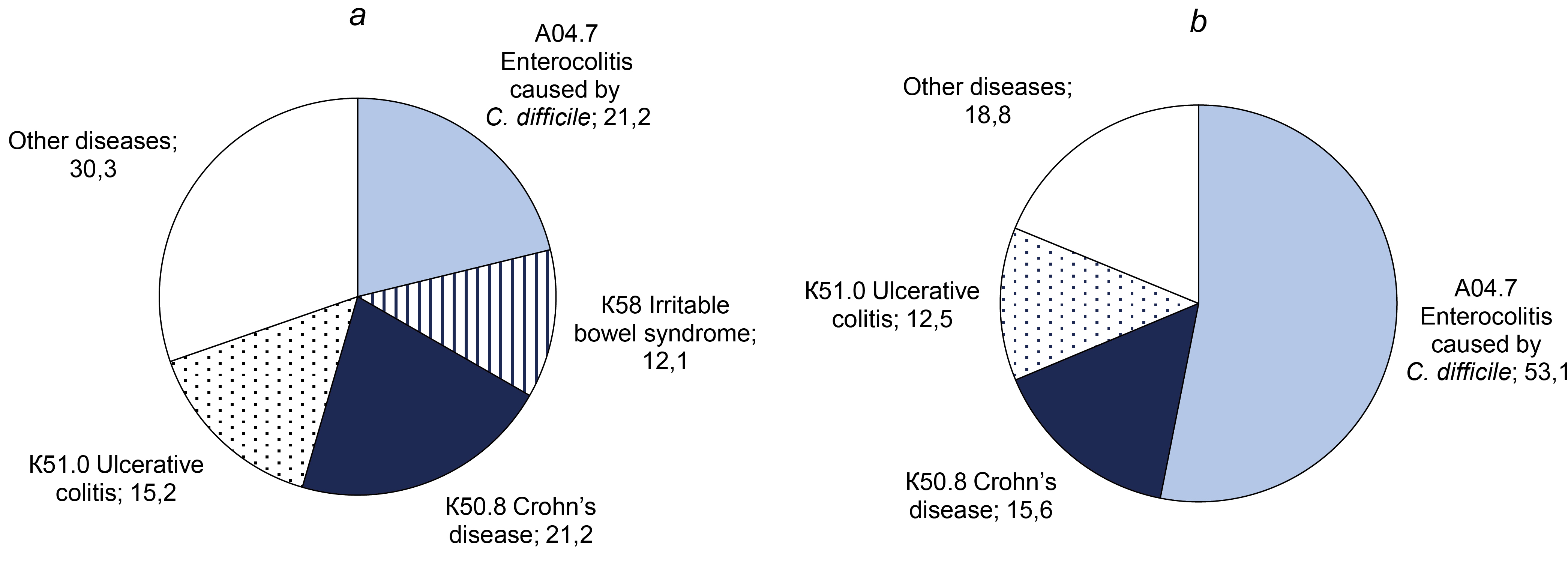 Distribution of confirmed diagnoses in patients with diagnosed non-toxigenic (a) and toxigenic (b) C. difficile strains.