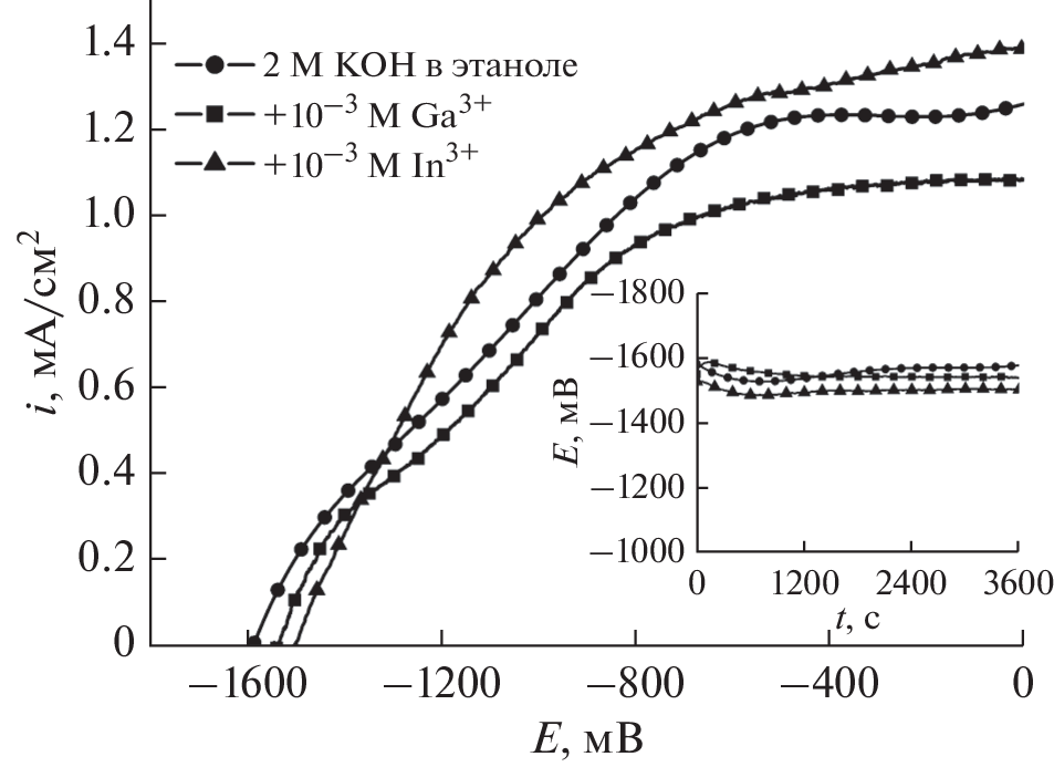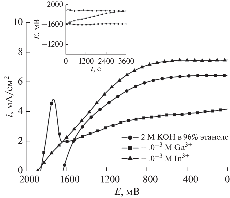 The anodic dissolution of aluminum in the KOH ethanol solutions is considered. It is shown that an addition of gallium and indium compounds to the 2 M KOH solution in 96% ethanol leads to an abrupt increase in the anodic dissolution current of aluminum near the open-circuit potential and its shift by 300 mV toward negative values. The discharge galvanostatic curves in the solutions with the additives of gallium and indium compounds contain a flat discharge plateau at the current densities up to 4 mA/cm2. The hydrogen evolution rate in a number of KOH ethanol solutions is measured.