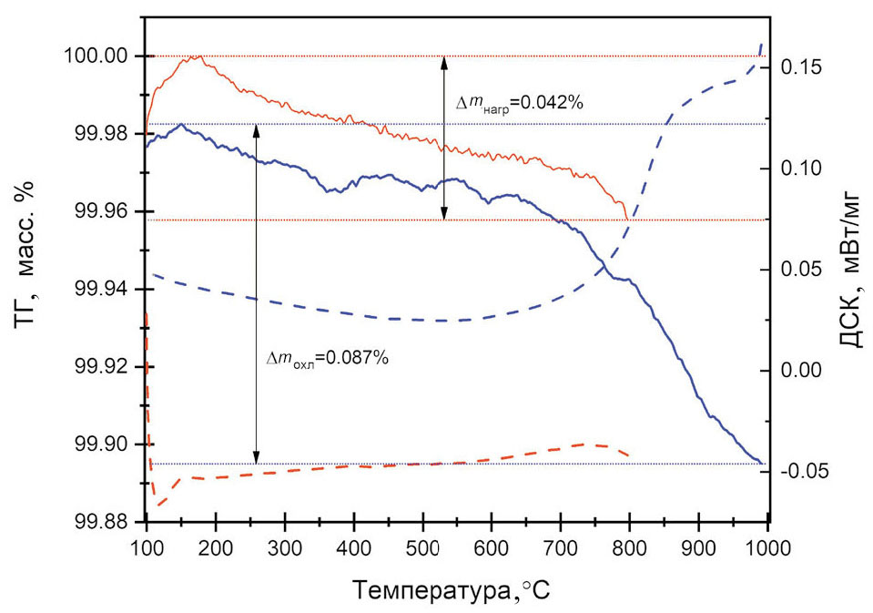 При проведении дифференциального термического анализа образец был предварительно нагрет до 1000 °C для устранения посторонних веществ с поверхности и влаги из объема. На рис. 3 изображены данные термогравиметрического анализа (ТГ) при охлаждении от 1000 до 100 оC. В данном сегменте наблюдается увеличение массы образца на 0,087%, что связано с незначительным поглощением кислорода из газовой смеси с явным экзотермическим эффектом. Последующее нагревание до 800 оC сопровождается потерями 0.042 мас.%, что демонстрирует низкую десорбционную способность данного состава по кислороду. При этом, судя по данным дифференциальной сканирующей калориметрии (ДСК), проявляется характерный для процесса выделения кислорода эндотермический эффект.