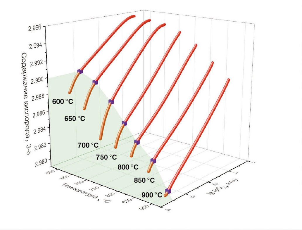 Стоит отметить, что кислородный транспорт в подобных материалах осуществляется за счет возникновения градиента химического потенциала кислорода в оксиде, который при достижении равновесия в процессе выделения кислорода из оксида становится равным химическому потенциалу кислорода в окружающем газе.