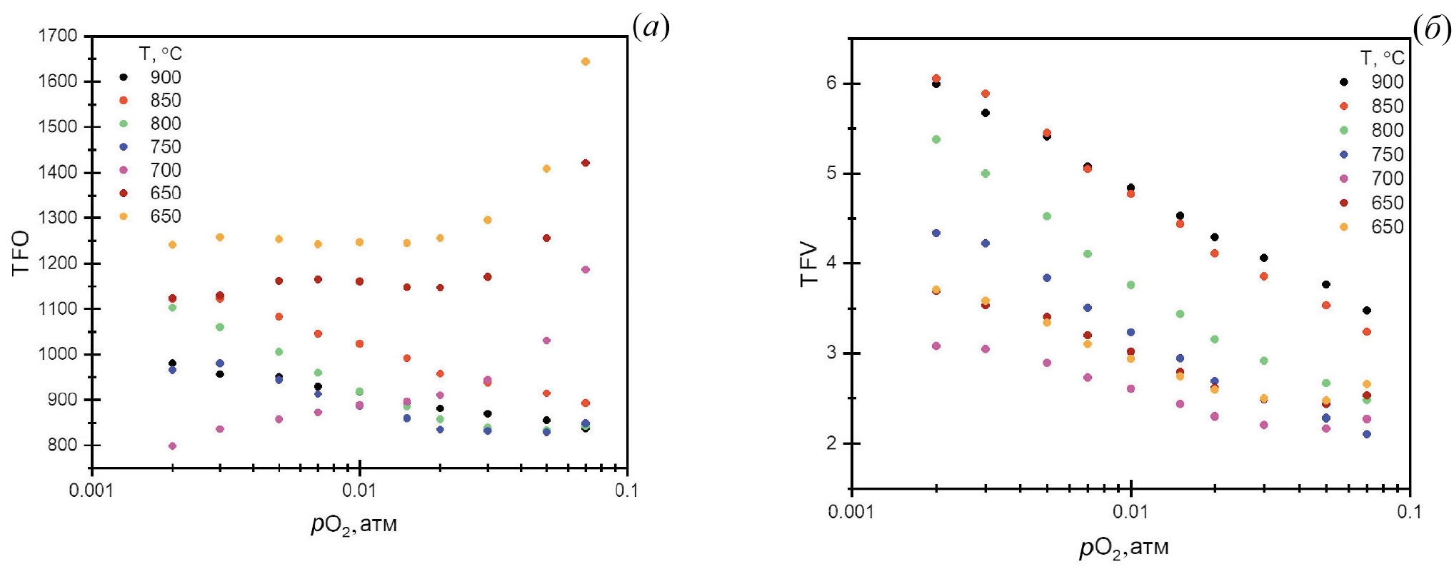 Рис. 6. Термодинамические факторы TFO (а) и TFV (б), полученные из равновесных изотермических симостей lg pO2–3 - δ – T.