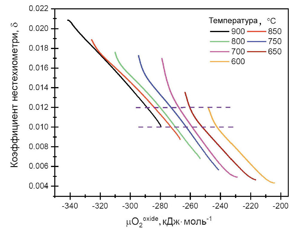 где μ0(T) – стандартный химический потенциал кислорода, рассчитываемый согласно работе [33]. Рассчитанный химический потенциал кислорода в оксиде показан на рис. 7.