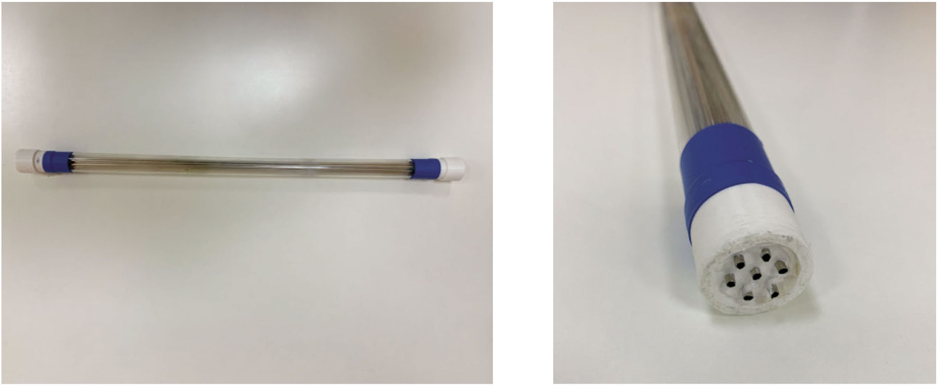 Для изготовления мембранного модуля были использованы капилляры из металлического никеля марки НП2 внешним диаметром 2.5 мм и толщиной стенки 50 мкм в количестве 7 шт. Капилляры фиксировали внутри кварцевой трубки с внешним диаметром 30 мм и толщиной стенки 2 мм. Фиксация капилляров осуществлялась с помощью торцевых втулок, каждая из которых состояла из двух частей для создания разделенных газовых пространств: (i) внутри капилляров и (ii) снаружи капилляров и внутри кварцевой трубки. Герметизация капиллярных трубок осуществлялась в месте их контакта с торцевыми втулками с помощью высокотемпературного силиконового герметика. Места герметизации располагались снаружи печи, в зоне, где температура не превышала 50 oС. Фотографии изготовленного модуля представлены на рис. 1.