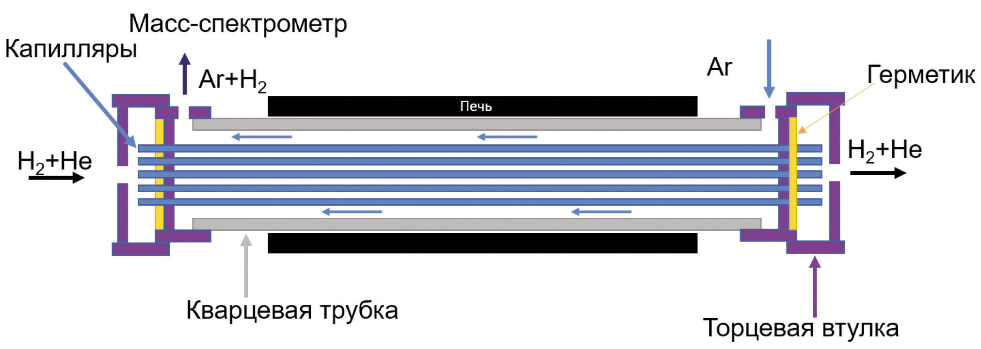 Тестирование модуля проводилось на установке, показанной на рис. 2. Исследования были выполнены в интервале температур 600–900 oС, так как в этом температурном интервале достигаются высокие значения потока водорода, а также имеется возможность интегрирования мембранного модуля в различные технологические процессы получения водорода и синтез-газа (конверсия или пиролиз углеводородов). Для создания газовых смесей использовали смеситель газов УФПГС-4 (Соло, Новосибирск). Внутрь капилляров подавали газовую смесь, состоящую из водорода и газа-носителя (гелий). Снаружи капилляров (и внутри кварцевой трубки) в противоположном направлении подавали продувочный газ (аргон). Таким образом, в наших экспериментах был реализован режим противопотока газов. В большинстве экспериментов скорость потока аргона составляла 150 мл/мин, а суммарная скорость потока водорода и гелия составляла 100 мл/мин. Варьирование парциального давления водорода осуществляли путем изменения скоростей потоков водорода и гелия. Варьирование парциального давления водорода осуществляли в пределах 0.5–0.9 атм. Состав газовой смеси на выходе из кварцевой трубки фиксировали с помощью квадрупольного масс-спектрометра QMS200.