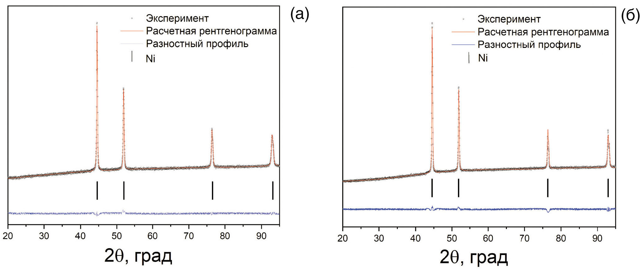 Рис. 4. Рентгенограммы Ni-капилляра до (а) и после (б) исследования водородной проницаемости. Сравнение экспериментально полученных рентгенограмм с рассчитанной методом Ритвельда.