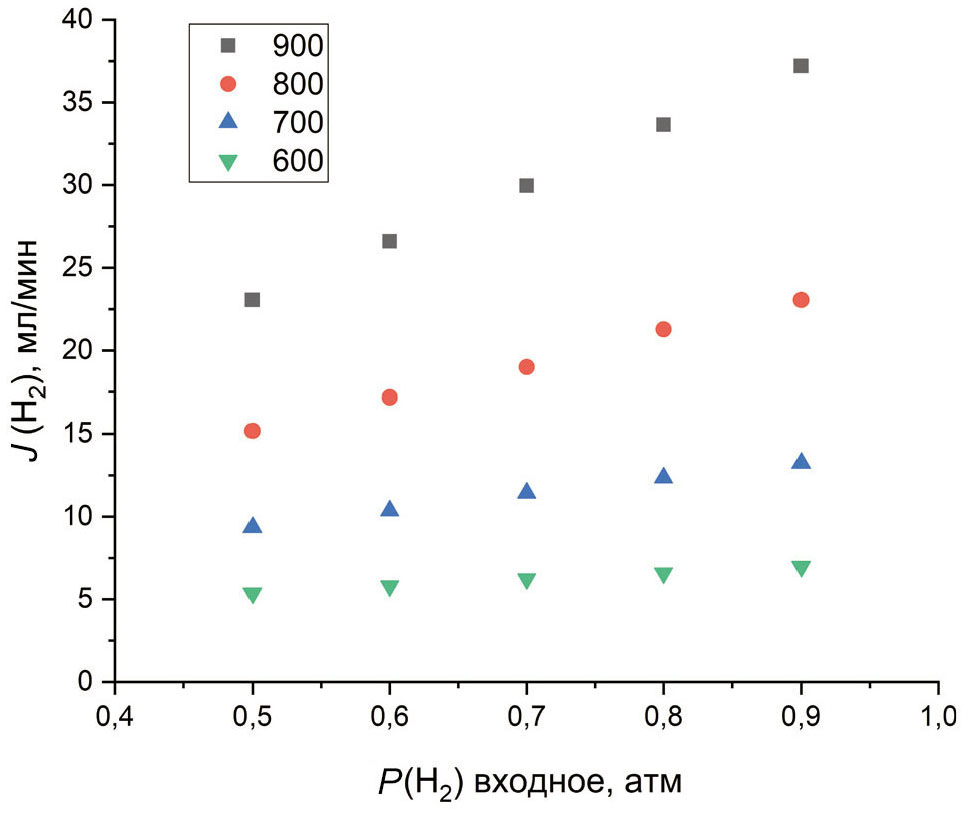 На рис. 5 приведена зависимость суммарного потока водорода от парциального давления водорода в газовой смеси для различных температур. Поток водорода возрастает с увеличением температуры и парциального давления водорода в смеси. Максимальный поток водорода составляет 37.2 мл/мин при температуре 900 оС и давлении водорода 0.9 атм. Наблюдаемые зависимости потока водорода от давления являются линейными во всем исследованном температурном интервале.