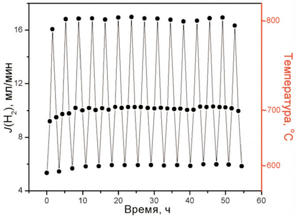 Для проверки устойчивости модуля к термоциклированию было проведено 15 циклов нагрева и охлаждения в интервале температур 600–800 oС. Выдержки при температурах 600, 700 и 800 oС составляли по 30 мин. Общее время испытаний на термоциклирование составило около 55 ч. По прошествии 15 циклов нагрев-охлаждение не было отмечено деградации характеристик модуля: снижения потока водорода либо увеличения натечки гелия.