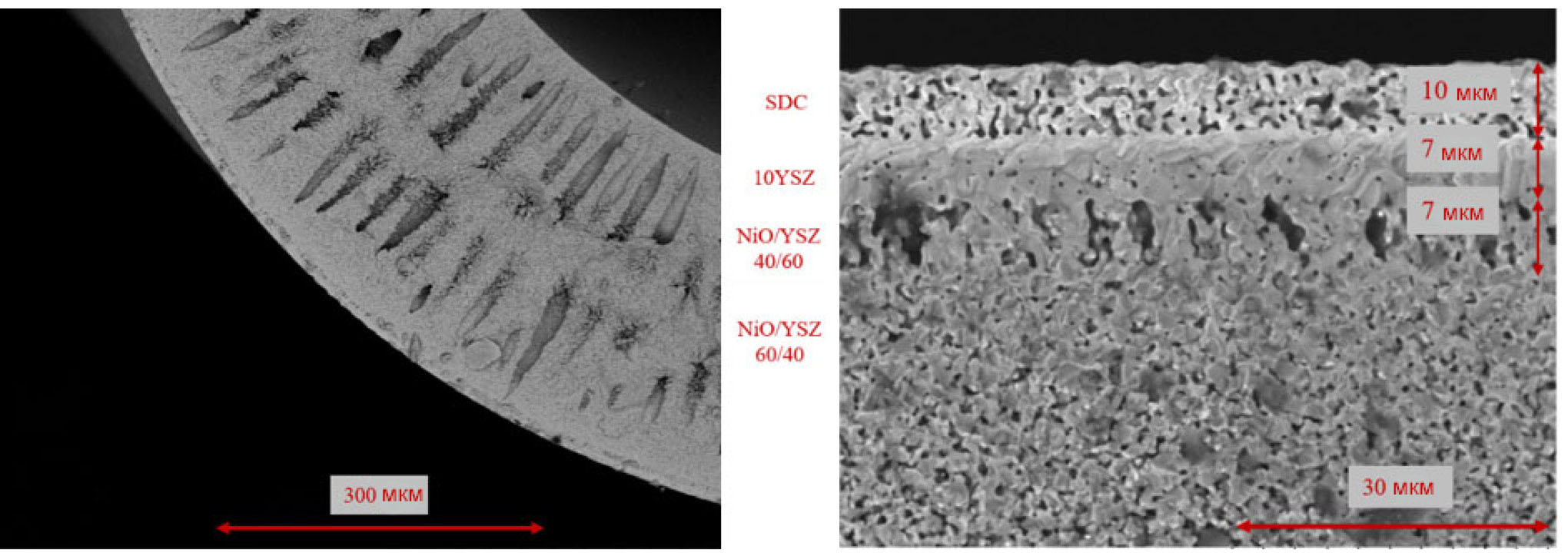 На рис. 1 представлены микрофотографии полученного полуэлемента ТОТЭ вплоть до БС. Анодная заготовка после спекания с АФС, электролитным и буферным слоями сохранила свою специфическую микроструктуру со сквозной пористостью и крупными продолговатыми порами, расположенными радиально по всей толщине микротрубки. Длина крупных продолговатых пор доходит до 150 мкм (рис. 1).