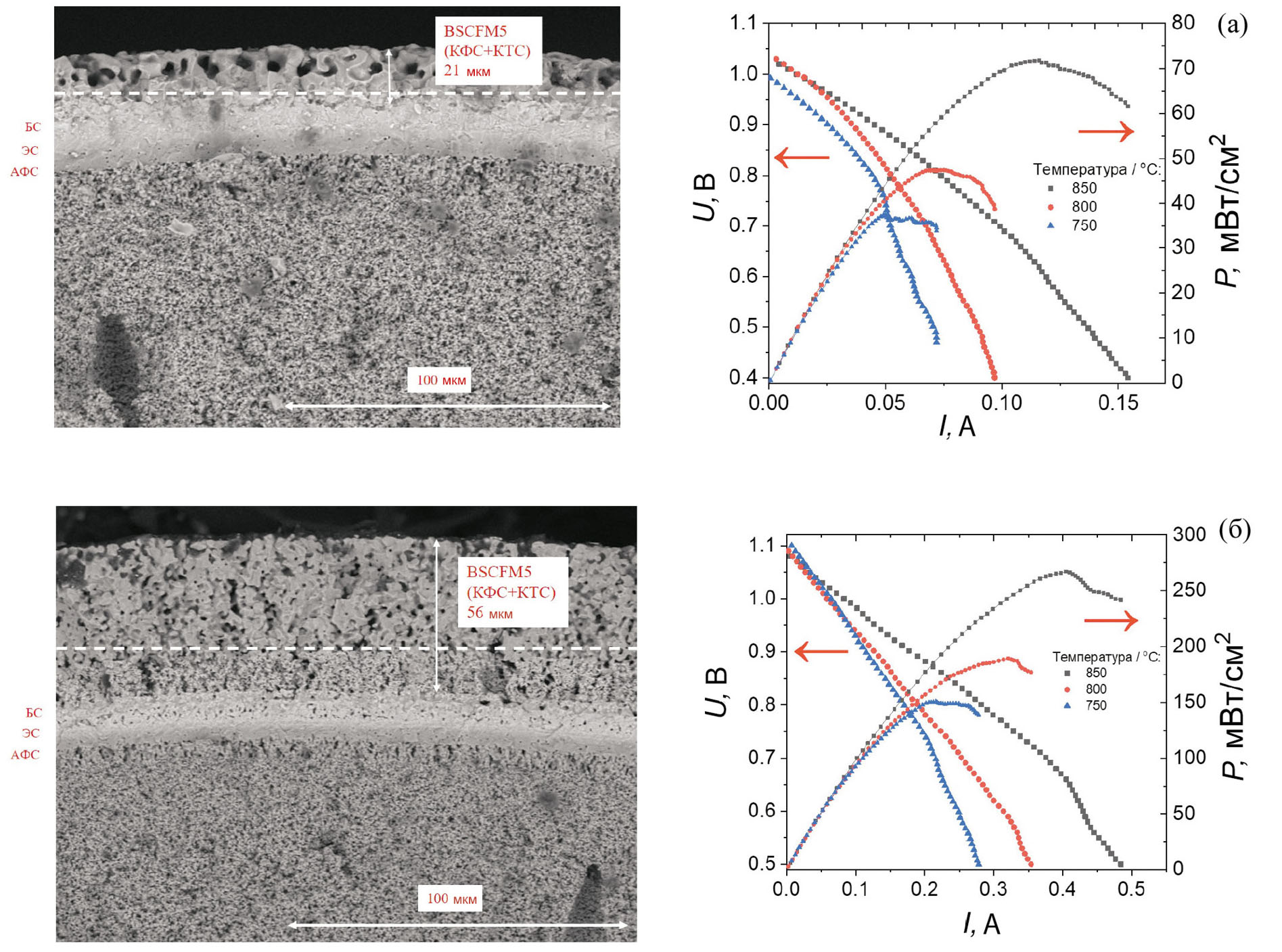 Таким образом, отработана и подобрана методика спекания слоев в МТ ТОТЭ, обеспечивающая газоплотность, механическую прочность и хорошую адгезию слоев без их смешения. Были измерены ВАХ единичных МТ ТОТЭ с катодом: Ba0.5Sr0.5Co0.75Fe0.2Mo0.05O3-δ (BSCFM5). Наибольшая мощность была достигнута на образце с катодным слоем толщиной 65 мкм. При этом было показано, что увеличение трехфазных границ за счет увеличения толщины КФС приводит к значительному возрастанию мощностных характеристик МТ ТОТЭ.