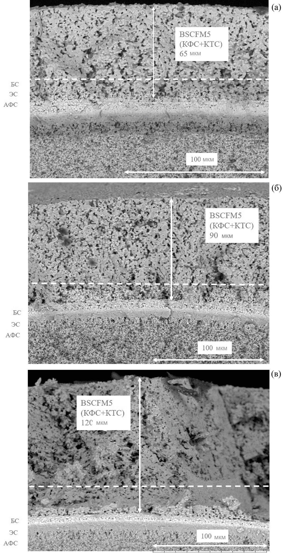 На рис. 2 представлены микрофотографии сломов МТ ТОТЭ. Визуально сложно отличить границу между КФС и КТС, поэтому ее обозначение условно. Далее говоря о “катодном слое”, будем иметь в виду толщину КФС и КТС. Тем не менее при измерении ВАХ можно увидеть зависимость получаемой мощности от толщин КФС и КТС.