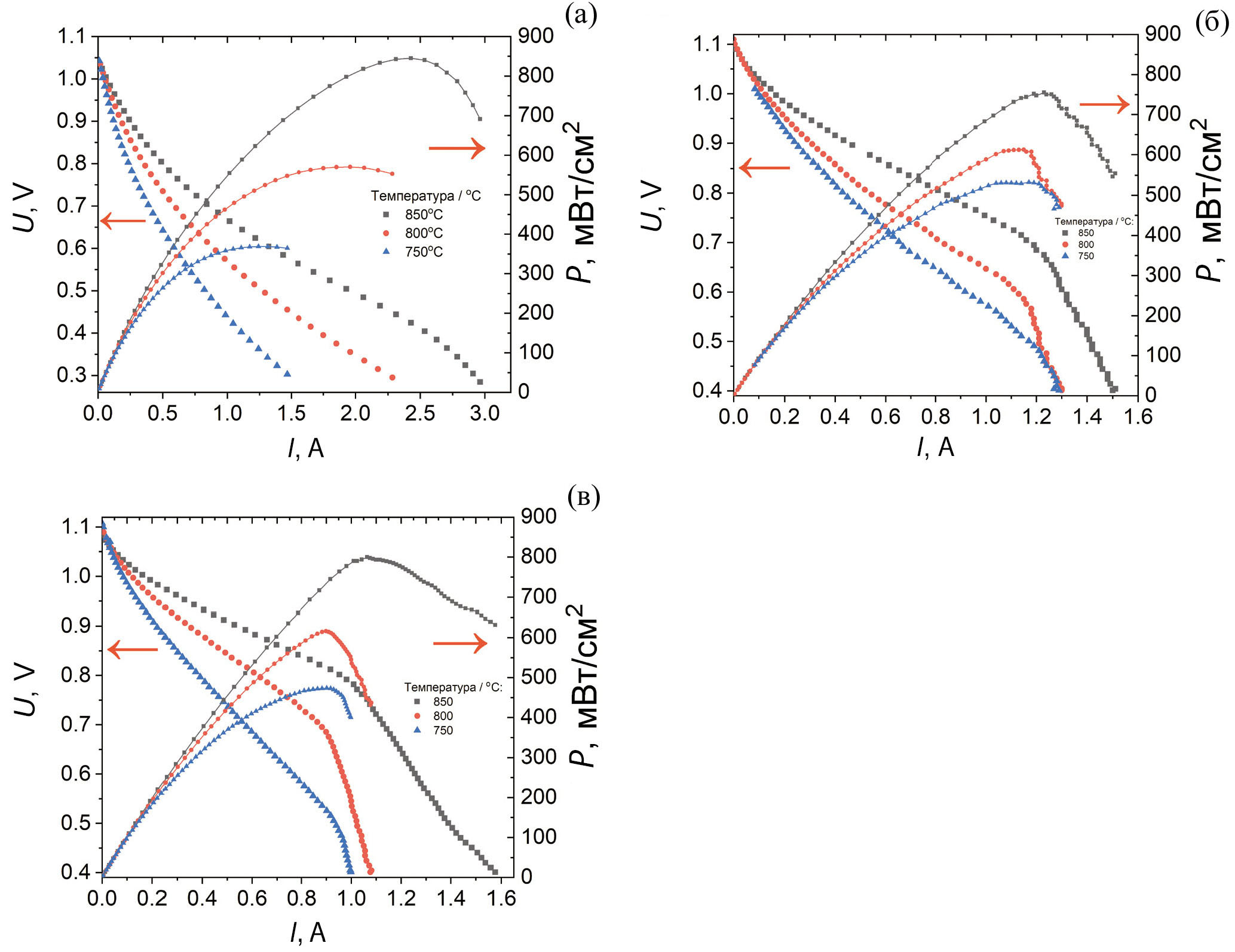 Рис. 4. Графики ВАХ МТ ТОТЭ с катодом BSCFM: толщина катодного слоя 65 мкм при 4 слоях КТС (а), толщина катодного слоя 70 мкм при 6 слоях КТС (б), толщина катодного слоя 120 мкм при 8 слоях КТС (в).