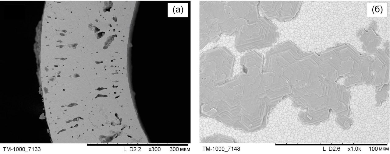 Согласно данным сканирующей электронной микроскопии (рис. 2а), полученные мембраны LSFN10 имеют плотную низкопористую структуру с порами закрытого типа. Характерная толщина стенки мембран LSFN10 h ≈ 265 мкм. Также было установлено наличие незначительного количества фазовых неоднородностей на поверхности оксида (рис. 2б).