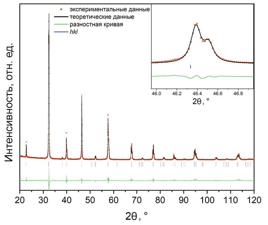 Для проведения рентгеновской порошковой дифрактометрии полученные таблетки оксидов предварительно измельчали. Исследования проводили с использованием дифрактометра D8 Advance (Bruker, Германия), используя высокоскоростной детектор LynxEye (СuKα-излучение). Данные были получены в диапазоне 2θ = 20–120о с шагом 0.02о и временем накопления 88.5 с в точке. Уточнение параметров ячейки проводили с помощью полнопрофильного анализа методом Ритвельда в ПО Topas 4.2.