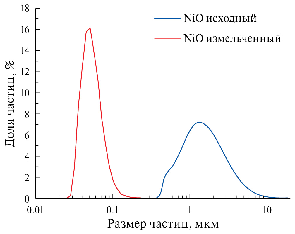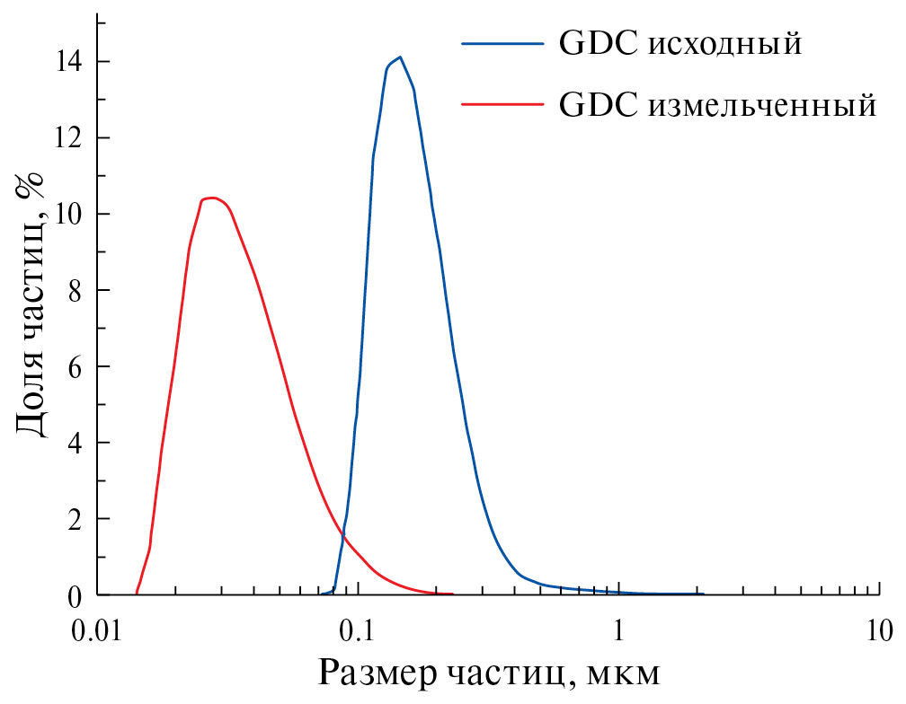 Одним из важнейших требований, предъявляемым к композитным материалам, является однородный гранулометрический состав частиц. Для этой цели исходные порошки NiO и GDC измельчали с использованием жидкого помола в бисерной мельнице в течение двух часов. На рис. 1 и 2 представлены распределения частиц по размерам для исходных частиц GDC и NiO и частиц GDC и NiO после измельчения. Как видно из рисунков, исходные и конечные порошки NiO и GDC имеют мономодальное распределение по размерам, при этом кривые распределения измельченных образцов смещаются влево, что указывает на уменьшение размера частиц. Так, после измельчения в бисерной мельнице средний размер частиц NiO уменьшается от 1.48 до 0.07 мкм, а средний размер частиц GDC – от 0.14 до 0.03 мкм.