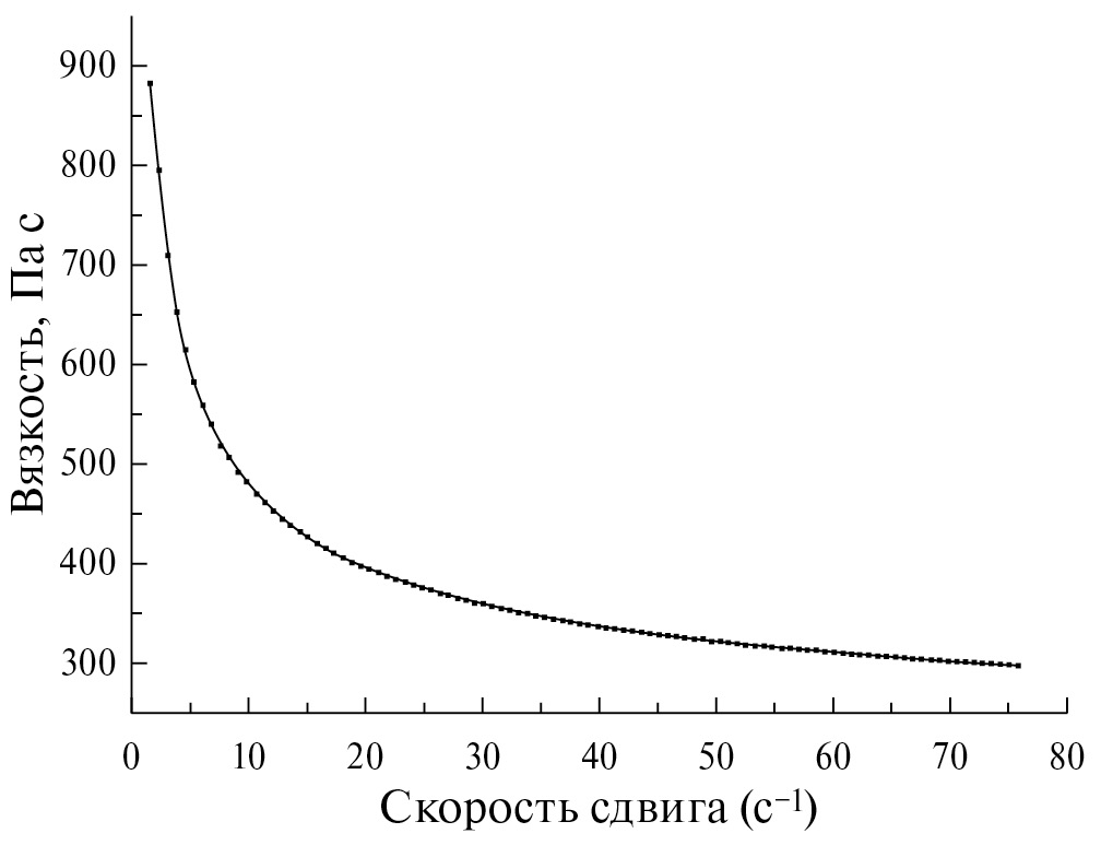 На основе полученного композита NiO-GDC готовили пасту. Для этого полимер PVB, дисперсант BYK и дибутилфталат (DBF) растворяли в бутилгликоле и помещали в бисерную мельницу с мелющими телами из YSZ8, затем добавляли порошки NiO и GDC. Для печати использовали пасту, содержащую 11.5% BYK от массы органической составляющей пасты. Чтобы соответствовать требованиям для струйной печати при использовании дозирующих сопел разного диаметра, состав органической пасты был следующим: массовое содержание твердой фазы ≤60 мас. %, размер частиц с процентильным содержанием D50 < 3 мкм (средний размер частиц должен быть примерно в 100 раз меньше диаметра сопла [17]). Полученную смесь диспергировали при скорости вращении ротора мельницы 4500 об/мин в течение 2 ч, затем пасту отделяли от мелющих тел. Исследована зависимость динамической вязкости полученной пасты от скорости сдвига (рис. 3). Как видно из рисунка, эта зависимость является нелинейной, что указывает на неньютоновский характер ее течения. При скорости сдвига, равной 6, 20 и 75 с–1, вязкости паст составляют 560, 396 и 300 Па c соответственно.