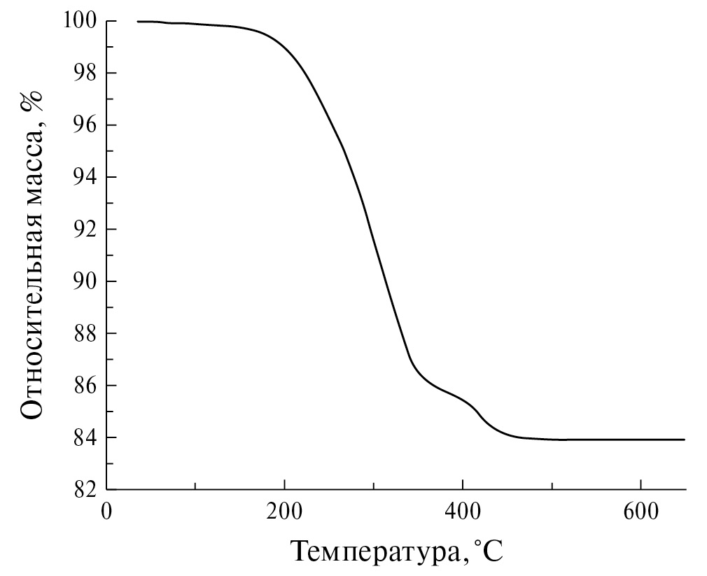 Для оптимизации параметров спекания анодной заготовки NiO-GDC был проведен его термогравиметрический анализ (рис. 5). Результаты термогравиметрии показали, что основная потеря массы образца NiO-GDC происходит при температуре 300–450°С. Максимальная потеря массы в ходе термического отжига достигается при ~450°С и составляет 84%, а при более высоких температурах кривая потери массы выходит на плато. Таким образом, для полного удаления органики из образцов, что необходимо для предотвращения деформации при усадке, надо выдерживать их какое-то время в указанном диапазоне температур.