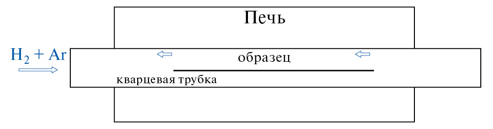 Образец, изготовленный струйной печатью, после отжига при оптимальных условиях (программа 3) был восстановлен в токе водорода. Это было необходимо для того, чтобы исследовать свойства образца в условиях работы ТОТЭ, когда анод находится в восстановительной атмосфере, в результате чего оксид никеля восстанавливается до металла. Процесс восстановления проводили в проточной печи длиной 20 сантиметров. Образцы помещали внутрь кварцевой трубки, поток газа, состоящего из водорода и аргона в объемных соотношениях 1 : 1, регулировали с помощью газового смесителя, расход газа составлял 30 мл/мин. Образец нагревали со скоростью 300°С в час до температуры 600°С. При заданной температуре композит выдерживали 1 ч. Схема проточного реактора приведена на рис. 8.
