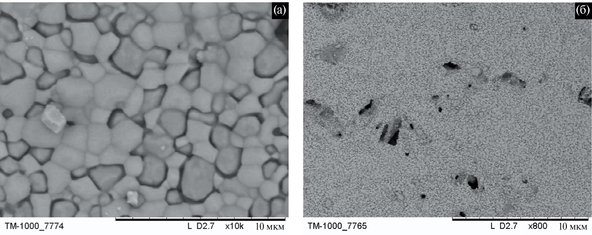 Морфология восстановленного образца Ni-GDC исследована методом электронной микроскопии. На рис. 10 приведены микрофотографии полученного анода Ni-GDC при двух увеличениях. Согласно данным РФА и электронной микроскопии, можно сделать вывод о том, что восстановление прошло полностью при сохранении структурной целостности образца. При этом восстановленный анод на микроуровне демонстрирует зернистую структуру, а на макроуровне – наличие сквозных пор и неоднородное распределение никеля по структуре.