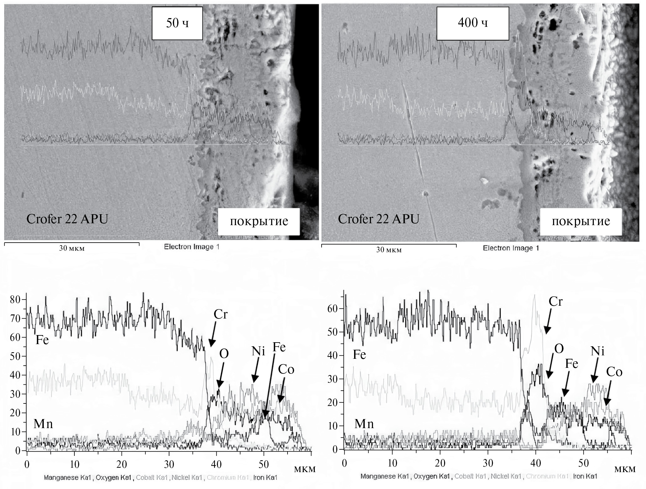 На рис. 4 приводятся микрофотографии с элементным анализом поперечных сечений переходов Crofer 22 APU/Ni-Co после окисления на воздухе в течение 50 и 400 ч при 850°С. После 50 ч на воздухе, согласно EDX-спектрам, продолжается диффузия Ni и Co в сталь, а также диффузия Fe в покрытие. При этом Cr и Mn остаются под поверхностью в виде Cr-Mn-оксида, т.е. защитное покрытие выполняет свою непосредственную функцию и блокирует хром под поверхностью. Спустя 50 ч окисления толщина Cr-Mn-оксида составляет ~3 мкм, а после 400 ч ~4 мкм. При этом ни в покрытии, ни на его поверхности хром не определяется. Поэлементное сканирование химического состава поперечных сечений сталь-покрытие показывает, что покрытие полностью окислилось и существенно изменился его состав. Согласно EDX-спектрам, окисленное покрытие содержит Ni, Co, Fe. После 400 ч окисления на воздухе железа в покрытии стало существенно больше, о чем говорят возросшие интенсивность и ширина спектров железа.