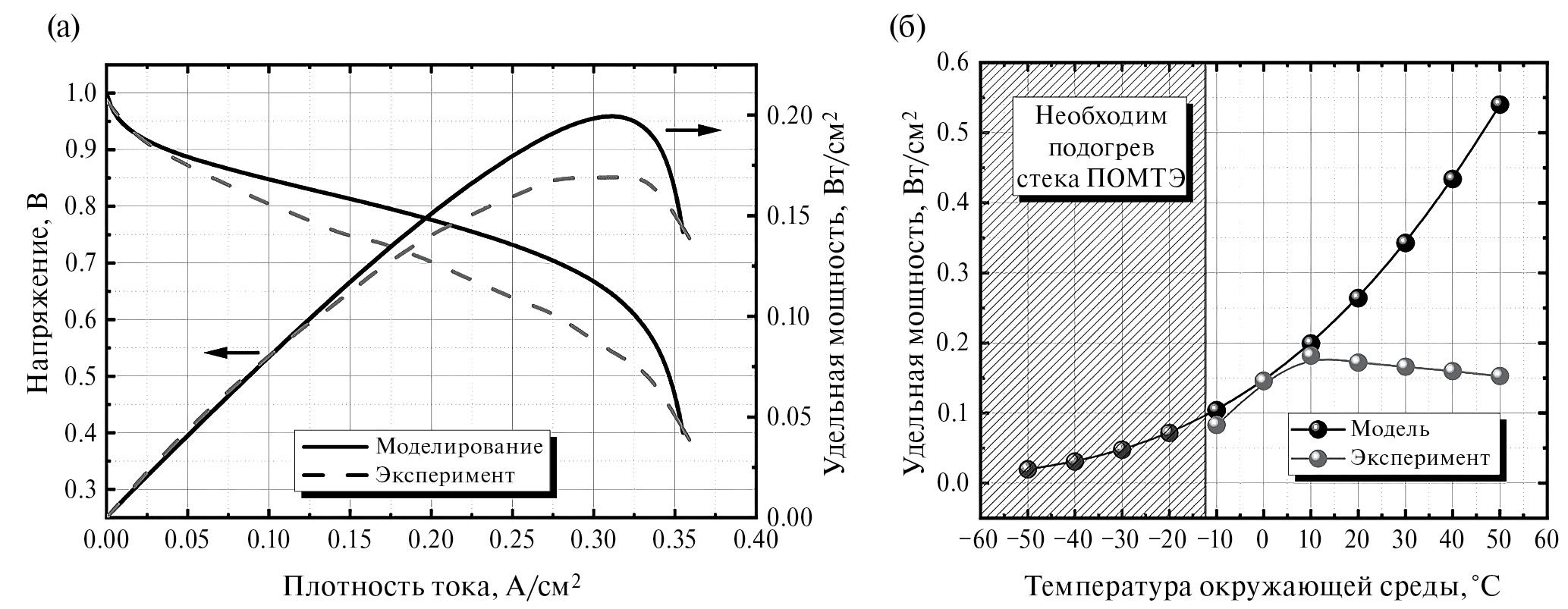 Расхождения между экспериментальными данными и моделированием вызвано несовершенством модели. Данная модель пока не учитывает некоторые химические и физические процессы, протекающие во время работы ПОМТЭ, которые могут оказывать значительное влияние на выходные характеристики ПОМТЭ при определенных условиях эксплуатации. Кроме того, модель не учитывает диффузию водорода и кислорода, гидравлического проникновения воды через ПОМ, эффекты газовой и тепловой конвекции, неоднородности в свойствах материалов (смачиваемость и пористость), многоступенчатую кинетику реакций, изменения тафелевского наклона, вызванные образованием оксида платины [15], а также эффекты в тонких пористых слоях [16, 17]. Электрическое и контактное термическое сопротивления [18], образование и таяние льда особенно сильно влияют на выходные характеристики ПОМТЭ при высоких и низких температурах окружающей среды. Расхождение между моделью и экспериментальными данными становится больше при повышении температуры окружающей среды выше +10°C. Это связано с ростом сопротивления металлических биполярных пластин и токоприемников в стеке ПОМТЭ вследствие увеличения удельного сопротивления металлов при нагревании. Кроме того, результаты моделирования показывают возможность работы ПОМТЭ при отрицательных температурах, поскольку модель не учитывает процессы образования и таяния льда, которые могут привести к снижению протонной проводимости ПОМ и нарушению его целостности в реальных условиях эксплуатации ПОМТЭ.
