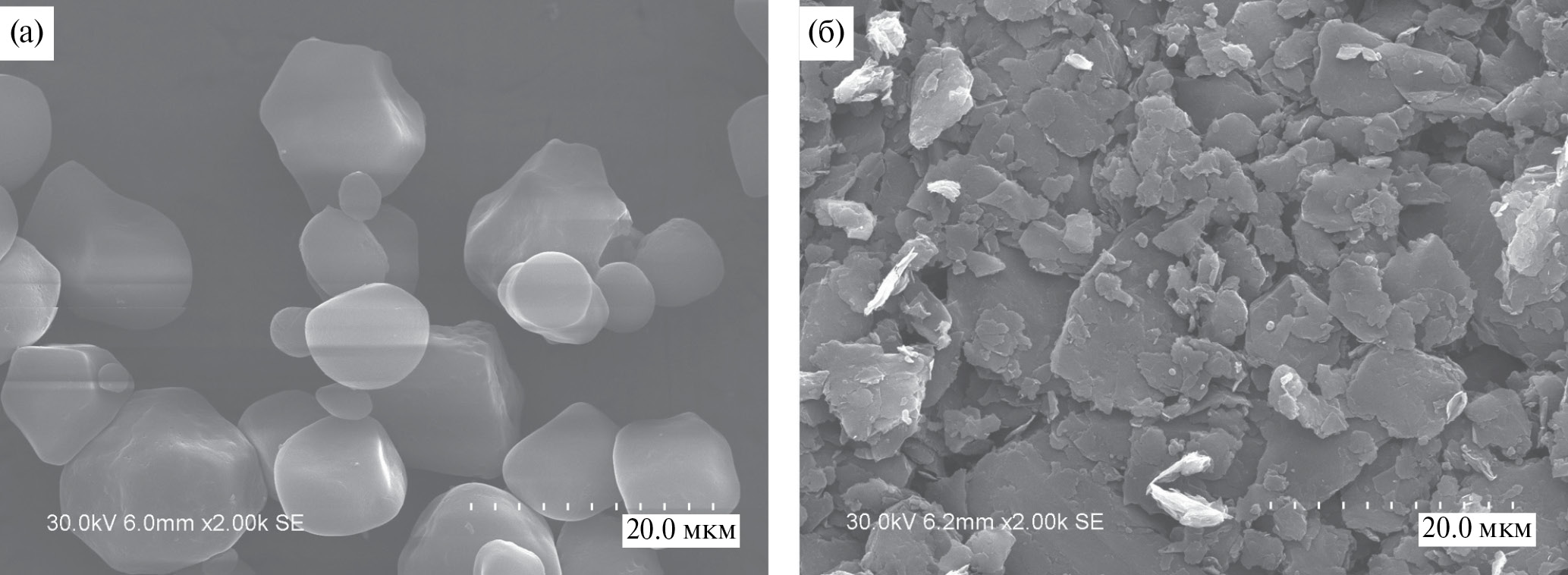 Рис. 6. Микроснимки порообразователей, используемых в печатных композициях на основе NiO/10YSZ: (а) крахмал, (б) графит.