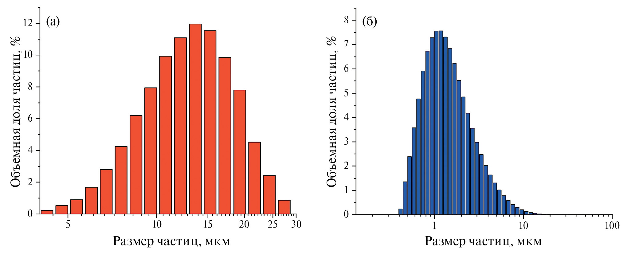 Рис. 7. Гранулометрия порошков порообразователей, используемых для 3D-печати анодов: (а) крахмал, (б) графит.