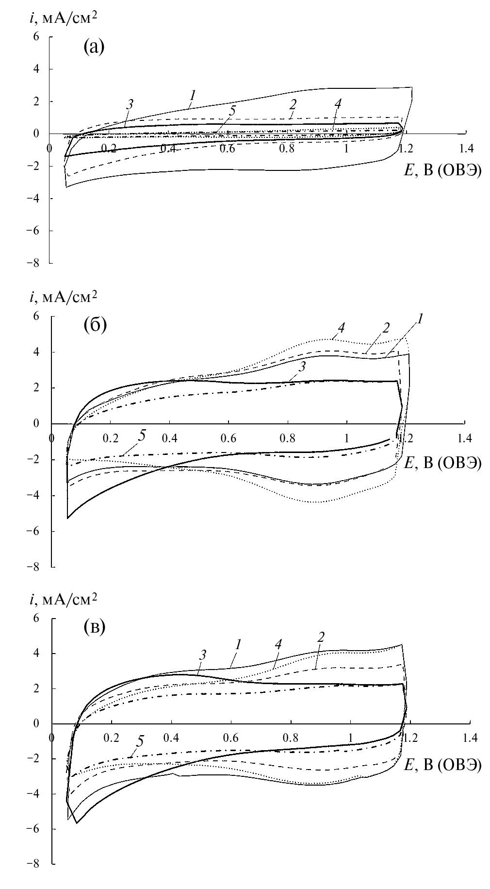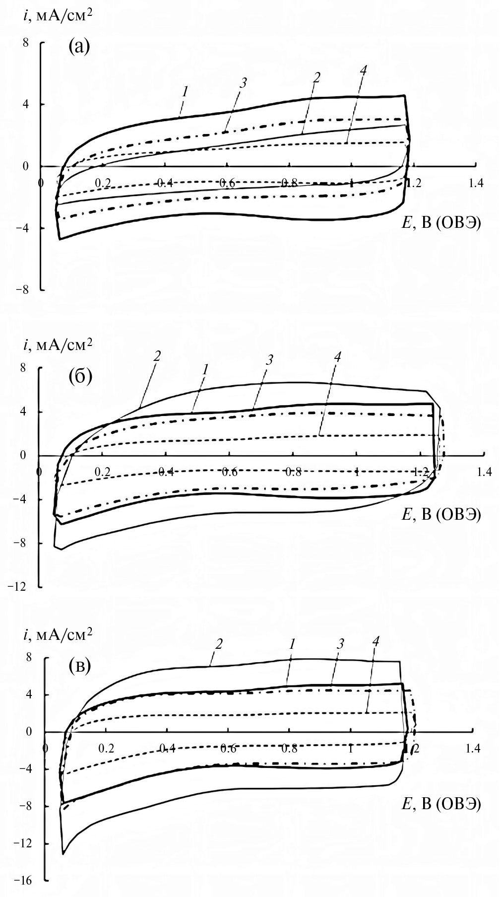 - Циклическая вольтамперограмма (ЦВА). Снималась в диапазоне потенциалов 0.05–1.2 В (ОВЭ) при скорости развертки 0.05 В/с и состояла из трех циклов (приведены кривые последнего цикла после стабилизации ЦВА).