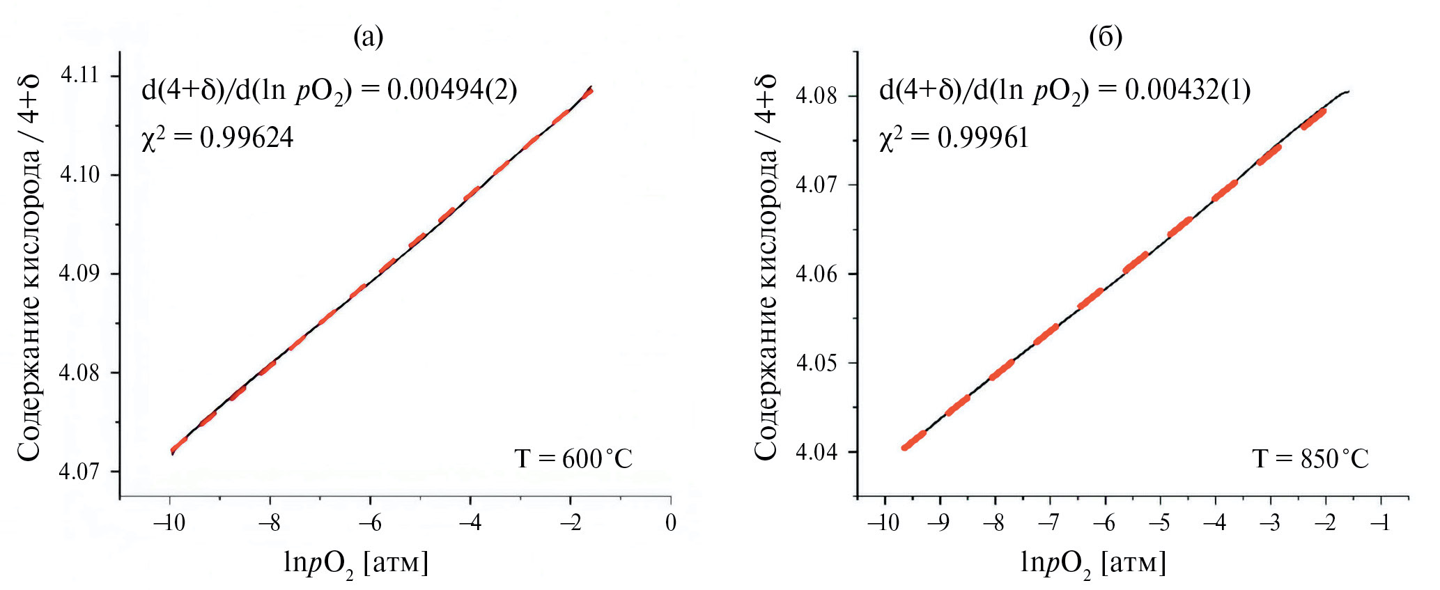 где δ0 – содержание кислорода при pO2 = 1 атм, β – параметр, линейно связывающий содержание кислорода и равновесное парциальное давление кислорода над образцом.