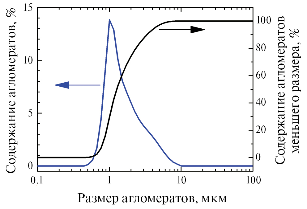 Электронные микрофотографии порошка приведены на рис. 2. Можно видеть, что частицы LMO представляют собой агломераты со средним размером порядка нескольких мкм. Они состоят из первичных кристаллов со средним размером около 160 нм (обработка изображений проведена c помощью Smile View); это вполне соответствует оценке среднего размера частиц по данным BET. Кривая распределения частиц по размерам, характеризующая агломераты, приведена на рис. 3; распределение близко к бимодальному с максимумом при 1 мкм (доминируют) и плечом при ~3 мкм, что вполне согласуется с результатами электронной микроскопии (рис. 2).