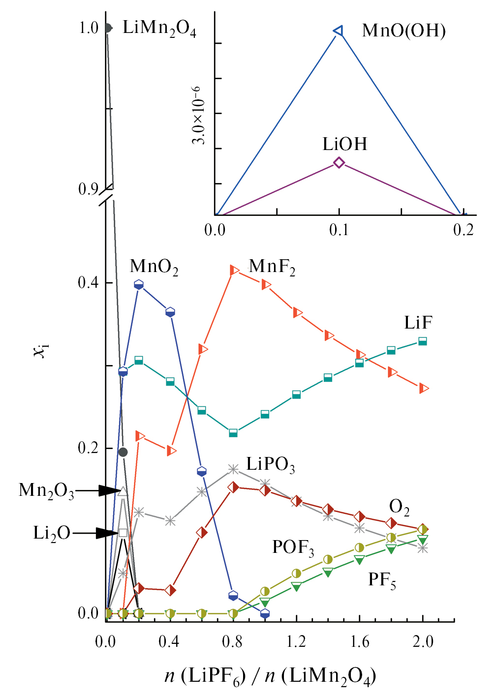 Из полученных данных следует, что литий-марганцевая шпинель термодинамически неустойчива по отношению к LiPF6, при этом состав равновесных продуктов взаимодействия существенно различается в условиях избытка одного или другого компонента исходной модельной системы (рис. 4). В условиях n(LiPF6)/n(LiMn2O4) ≥1 (т.е. при доминировании LiPF6) качественный состав равновесных продуктов сохраняется неизменным, варьируется лишь их количественное соотношение. В этой области концентраций можно прогнозировать образование единственного соединения марганца – растворимой в электролите соли MnF2, двух не растворимых в электролитном растворе солей лития LiF и LiPO3, газообразного кислорода и кислот Льюиса PF5 и POF3. Важной особенностью является то, что мольная доля PF5 и POF3 при избытке LiPF6 довольно значительна и монотонно увеличивается с ростом содержания LiPF6 в модельной системе (рис. 4). Такое количество POF3 никак не может быть обусловлено наличием следовых количеств воды и гидролизом литиевой соли, так как мольная доля воды x (H2O) в исходных смесях составляет лишь ~10–5. По-видимому, в условиях избытка LiPF6 образование POF3 обусловлено непосредственным взаимодействием LiPF6 с LiMn2O4.