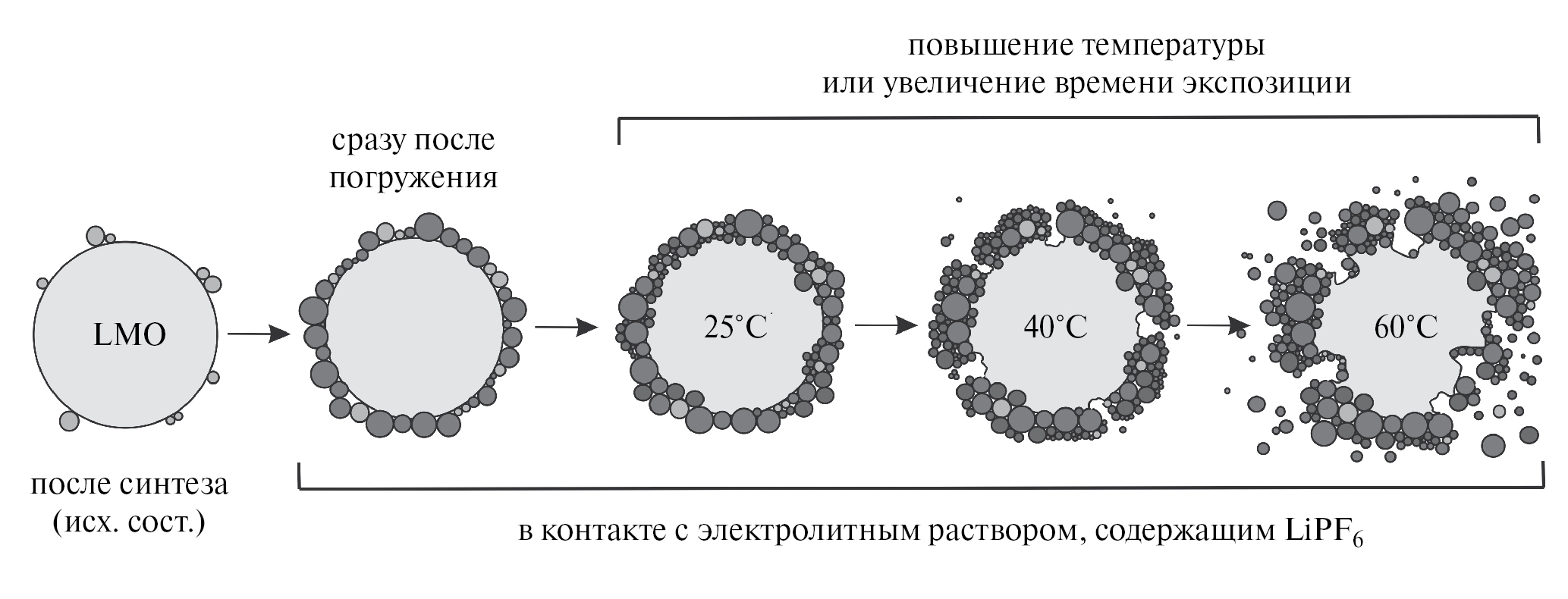 Многочисленные попытки установить причины деградации электродов на основе литий-марганцевой шпинели выявили протекание целого ряда нежелательных процессов [6, 14, 18, 30]. Часть из них относится к структурным перестройкам в самой литий-марганцевой шпинели и дефектообразованию в объеме и на поверхности гранул LMO, тогда как остальные так или иначе связаны с побочными химическими и электрохимическими реакциями на межфазной границе LMO/электролит и активным нарастанием на поверхности положительного электрода интерфейсного слоя, называемого cathode electrolyte interphase (CEI). Если структурные превращения LMO в процессе экстракции/внедрения ионов лития к настоящему времени довольно хорошо изучены [4, 8, 17], то сведения относительно побочных реакций на межфазной границе и формирования CEI неполны и крайне противоречивы. Это не позволяет воссоздать цельную картину деградации электрода на основе LMO, а следовательно, не дает возможность найти эффективные способы ее предотвращения или замедления. (Отметим, что описанные в литературе подходы к стабилизации LMO пока так и не были внедрены в производство.) Таким образом, несмотря на более чем 20-летние интенсивные исследования, проблема стабилизации электрода на основе LMO остается нерешенной [3, 6, 18, 31].