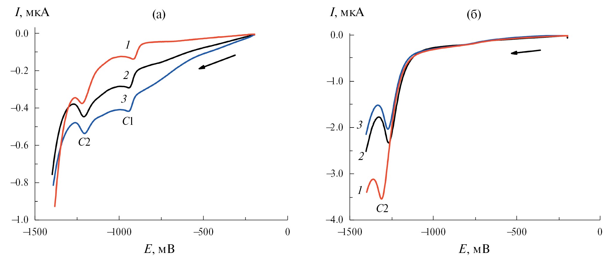 Рис. 2. Катодные вольтамперограммы Au/SR–NH2 электрода, полученного при выдержке 120 с при Е = −200 мВ в деаэрированном растворе 0.1 мМ тиола + 0.02 М щелочного (а) и перхлоратного (б) раствора с разными катионами: 1 — Li+, 2 — Na+, 3 — K+.