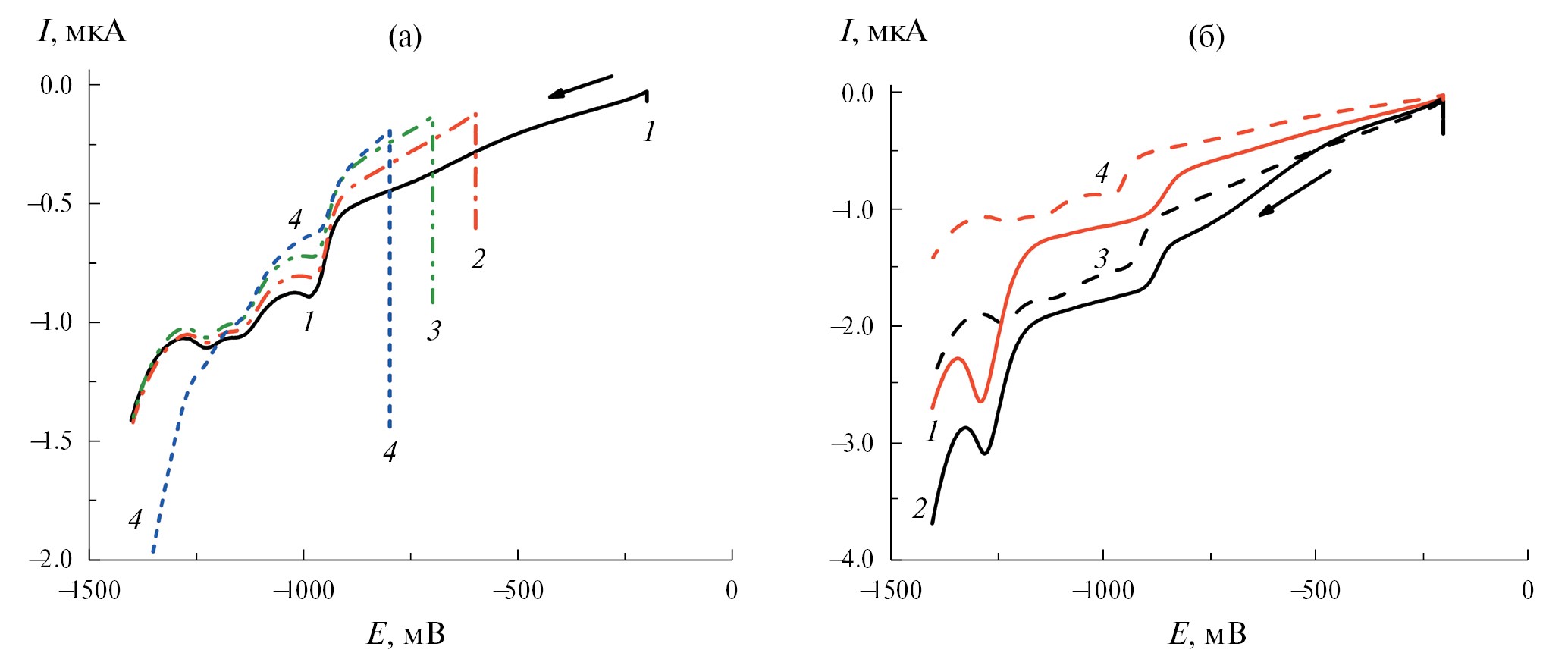 Рис. 3. Катодные вольтамперограммы Au/SR–NH2 электрода, полученного при выдержке 120 с в аэрированном растворе: (а) 0.1 мМ тиола и 0.02 М NaOH при разных потенциалах Е, В: 1 — (–0.2), 2 — (–0.6), 3 — (–0.7), 4 — (–0.8); (б) 0.1 мМ тиола и 0.02 М (NaClO4 + NaOH) при Е= –200 мВ при разных рН раствора: 1 — 6.0 (0.02 М NaClO4), 2 — 11.2, 3 — 11.9, 4 — 12.3 (0.02 М NaOH).