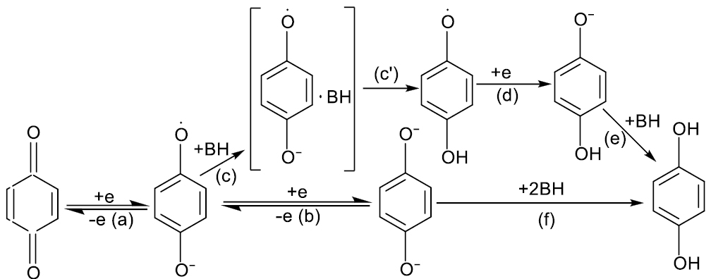 Примерно по такой же схеме восстанавливаются и другие хиноны — нафтохинон, антрахинон и их производные. После переноса первого электрона образуется анион-радикал — семихинон (стадия а), который присоединяет 2-й электрон с образованием дианиона (стадия b). Дианион присоединяет протоны из растворителя (донора протонов BH), образуя в простейшем случае гидрохинон (стадия f). Последующие превращения донора протонов на схеме не показаны. В отдельных случаях не исключена и димеризация семихинона, для анион-радикалов ароматических соединений такая реакция достаточно характерна [44].