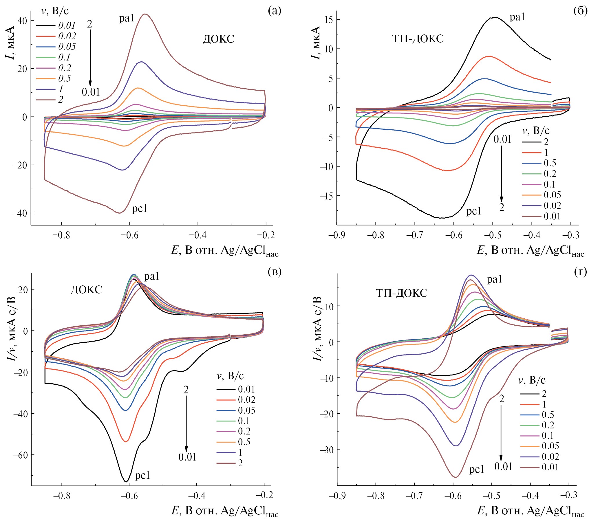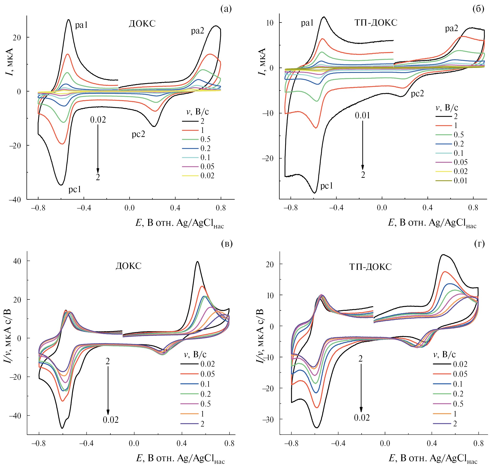 На рис. 9 приведены ЦВА-кривые для пары анодно-катодных пиков — pa2 и pc2, полученные в узком диапазоне анодных потенциалов — от +0.1 до +0.9 (ТП-ДОКС) и от −0.4 до +0.9 В (ДОКС) при анодном направлении развертки. Наблюдаются те же закономерности, что и для ЦВА-кривых в широком диапазоне потенциалов: и катодный пик pc2, и анодный пик pa2 по характеру близки к адсорбционным при наибольших скоростях развертки (v ≥ 1–2 В/с), а пик pa2 — к диффузионному при наименьших (v ≤ 0.05–0.02 В/с); в промежуточной области v имеет место смешанный адсорбционно-диффузионный процесс (рис. 9б). Катодный пик pc2 не похож на диффузионный при всех v, и для него влияние адсорбции выражено больше (рис. 9б).