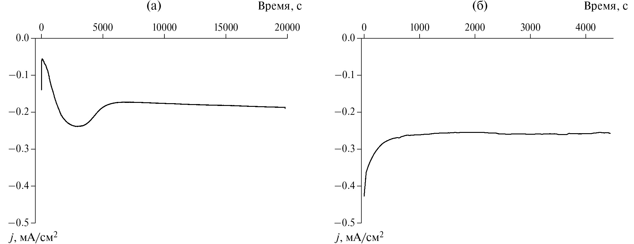 Из-за наличия слоя SEI транзиенты плотности тока при наложении ступеньки потенциала в область электроосаждения лития имеют сложный вид, отличающийся от вида транзиентов при “обычном” электроосаждении. Такие типичные транзиенты в растворах без добавления ПАВ приведены на рис. 2а для электроосаждения лития на медный электрод и рис. 2б для электроосаждения лития на электрод из лития.