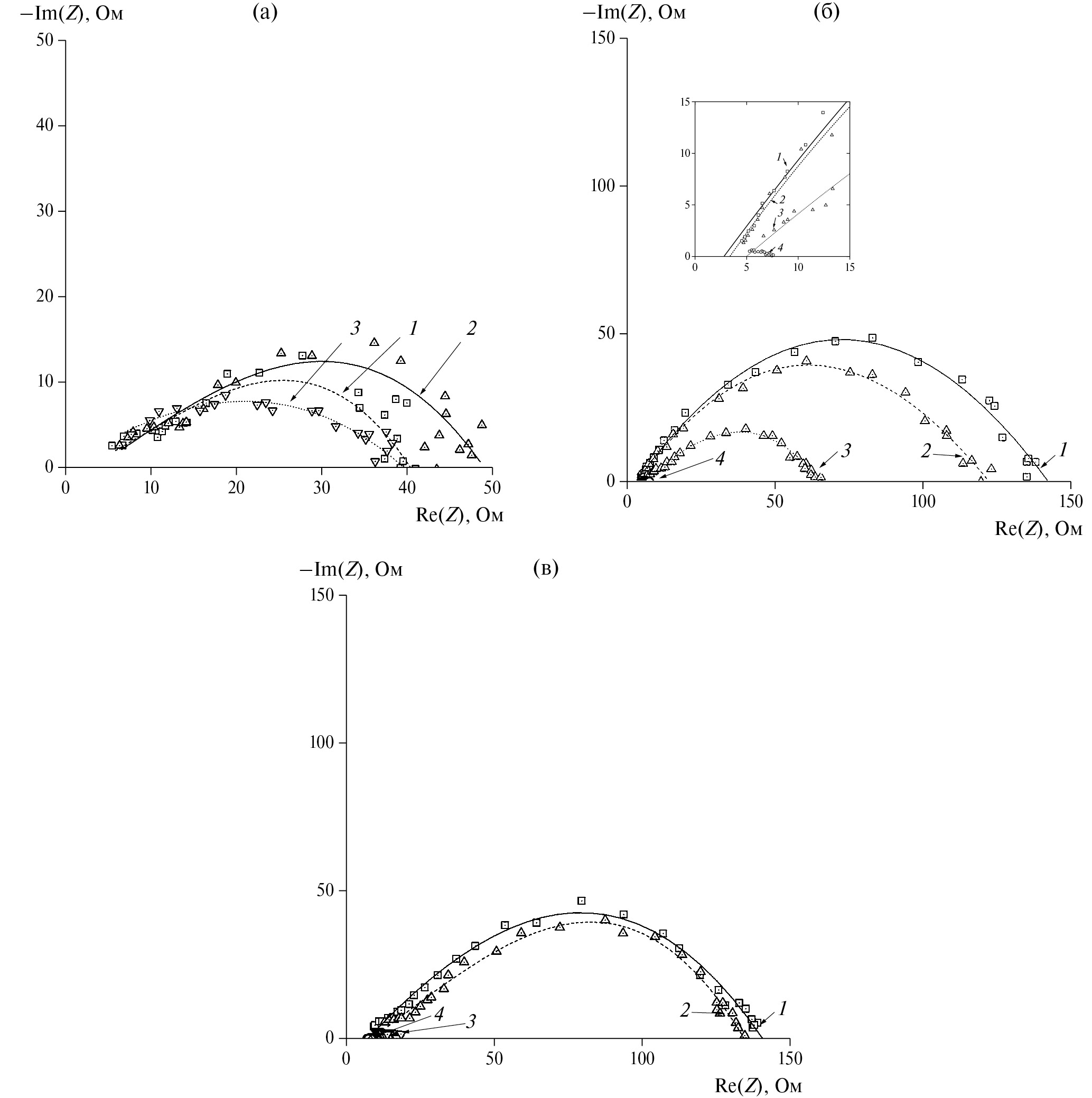 Рис. 7. Эволюция годографов импеданса для электроосаждения лития на электроде из лития. (а) Электролит без добавок ПАВ; (б) с добавкой C₁₆Me₃Br; (в) с добавкой C₁₆PyBr. Потенциалы: (а) 1 – –0.07 В, 2 – –0.075 В, 3 – –0.11 В; (б) 1 – –0.03 В, 2 – –0.035 В, 3 – –0.05 В, 4 – –0.06 В; (в) 1 – –0.06 В, 2 – –0.065 В, 3 – –0.07 В, 4 – –0.08 В. Импедансы измерены после электроосаждения лития. На врезке рис. 7 (б) показана увеличенная область начала годографов в области высоких частот.