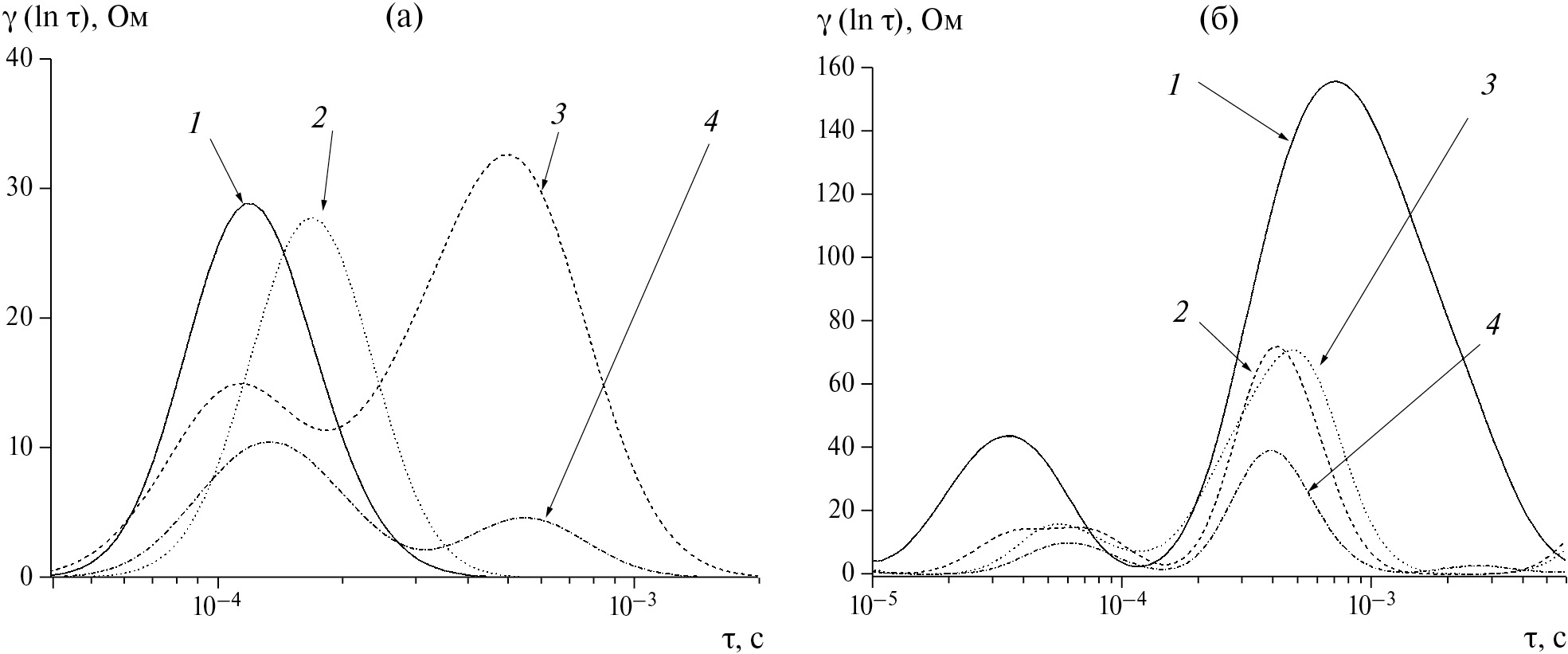 Рис. 3. Спектры времен релаксации в среднечастотной области, соответствующей импедансу твердоэлектролитной интерфазы/слоев SEI, полученные (а) в базовом электролите без добавления ПАВ и (б) в электролите при добавлении бромида гексадецилпиридиния. (1, 3) Спектры (1) литиевого и (3) медного электрода до электроосаждения; (2, 4) спектры осадков металлического лития, электроосажденных на (2) литиевый и (4) медный электроды.