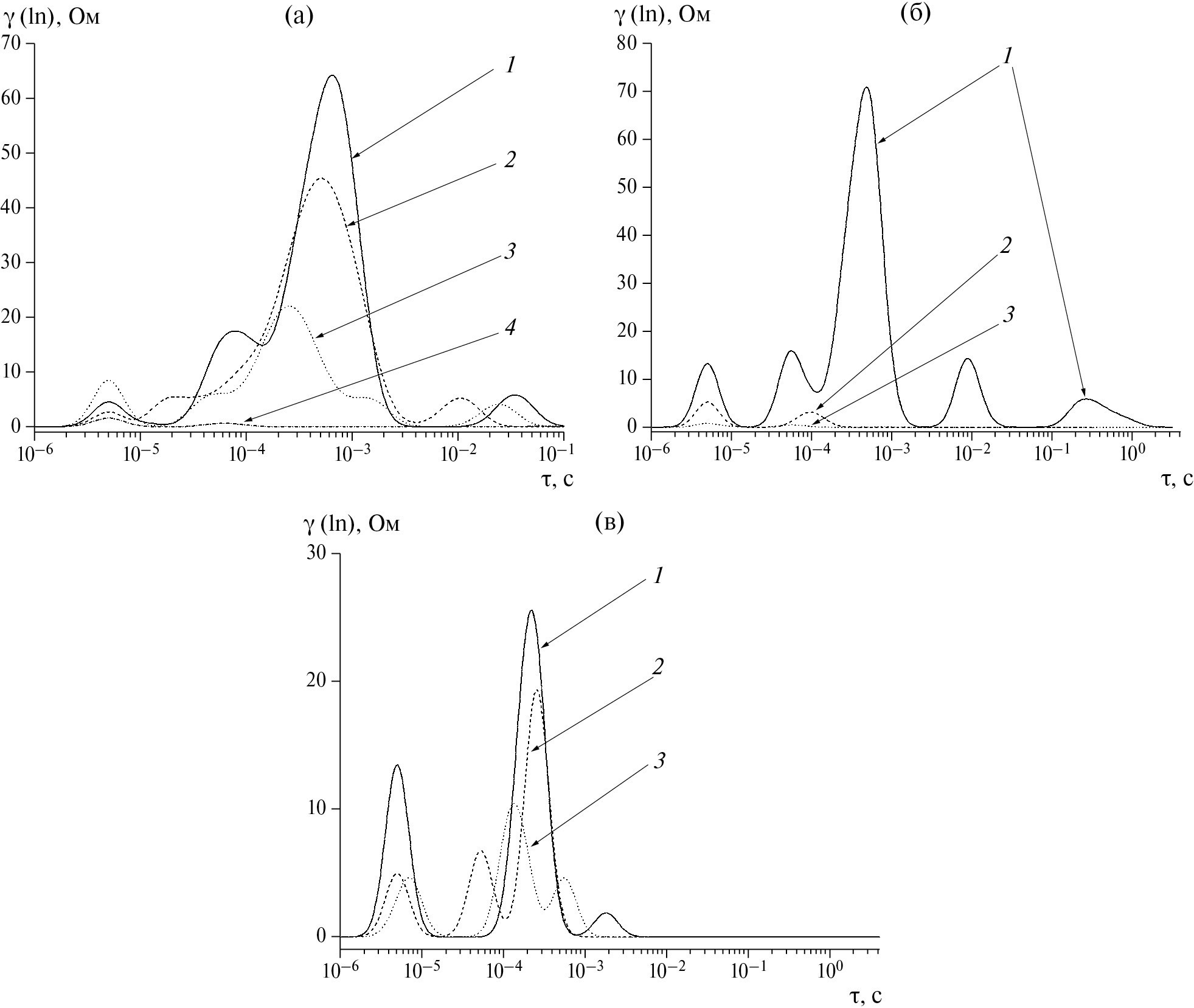 Рис. 4. Эволюция спектров времен релаксации, полученных обработкой импедансных данных для лития, электроосажденного при различных потенциалах на подложку из (а, б) лития и (в) меди. Электролит (а) с добавкой бромида цетилтриметиламмония; (б) с добавкой бромида гексадецилпиридиния; (в) без добавок ПАВ. Потенциалы: (а) 1 – –0.03 В, 2 – –0.035 В, 3 – –0.05 В, 4 – –0.06 В; (б) 1 – –0.065 В, 2 – –0.07 В, 3 – –0.08 В; (в) 1 – –0.03 В, 2 – –0.04 В, 3 – –0.055 В. Импедансы измерены при потенциале разомкнутой цепи после электроосаждения лития.