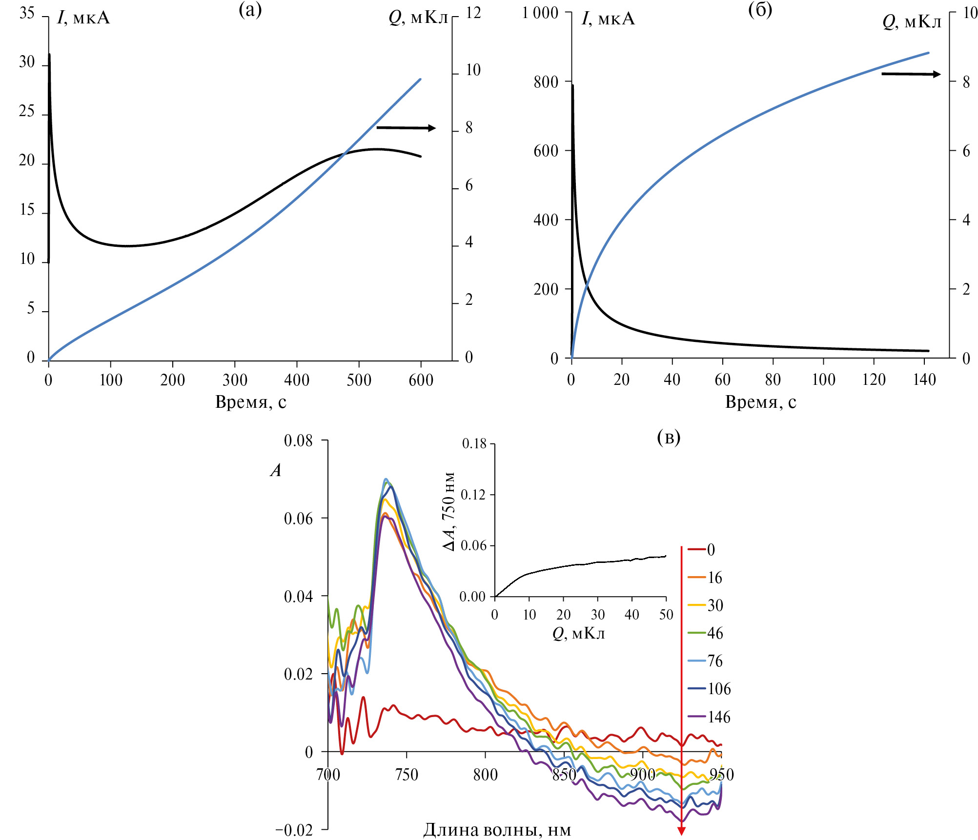 Рис. 3. Динамика изменения тока (I), заряда (Q) и спектров оптического поглощения (A) в процессе ПС-осаждения слоя PPy-ZnPc из водного раствора 0.01 М пиррола и 0.0025 М ZnPc на электроде FTO: (a) без подслоя (Epoly = 1.0 В); (б) с подслоем PPy-PAMPSNa (Epoly = 0.8 В); (в) спектры (на вставке: изменение поглощения на 750 нм в зависимости от заряда, пошедшего на электрополимеризацию Py) в процессе синтеза на подслое (цифры в легенде – время, с, от начала синтеза)