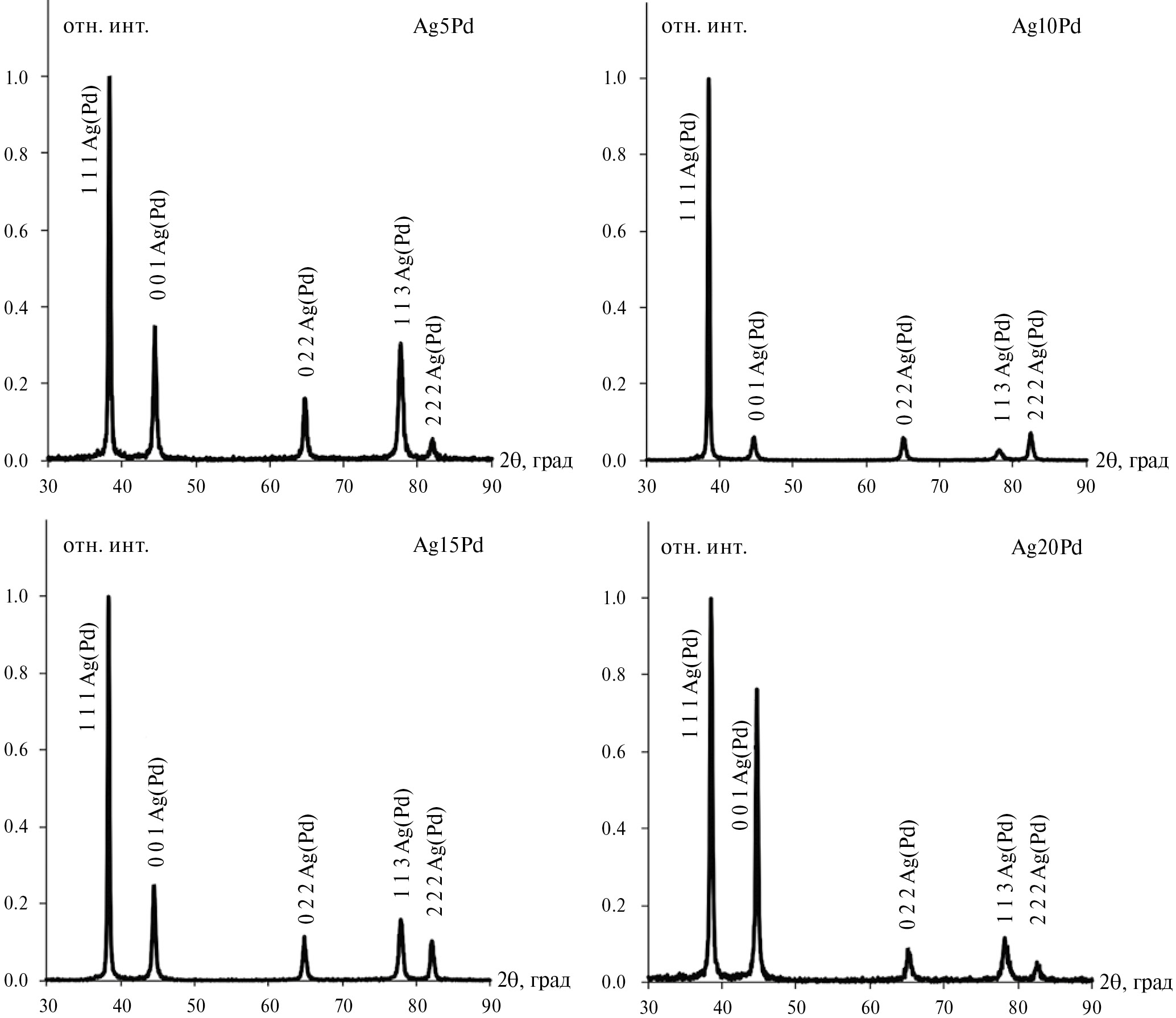Данные о фазовом составе сплавов получены с помощью рентгеновского дифрактометра ARL XʹTRA1 (Thermo Scientific; Швейцария). Тип сканирования – 2θ-сканирование; начальный угол сканирования – 25°; конечный угол сканирования – 90°; шаг – 0.05°; непрерывный режим сканирования с длиной волны 1.540562 нм. На рентгеновских дифрактограммах сплавов системы Ag-Pd, представленных в относительных единицах, регистрируются пики, характеризующие различные кристаллографические ориентации альфа-фазы Ag(Pd) (рис. 1). Основой данной фазы является гранецентрированная решетка серебра. Максимальная интенсивность на всех образцах наблюдается для пиков, характеризующих грань (111).