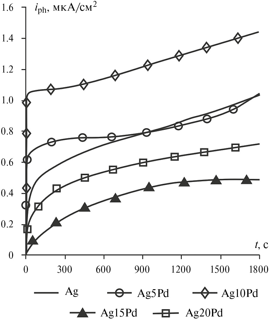 Можно предположить, что изменение характера зависимости фототока от концентрации палладия связано с изменением состава оксидной пленки. Если в процессе анодного окисления помимо оксида серебра формируется еще и оксид палладия, обладающий p-типом проводимости [27–29], то фиксируемый фототок представляет суперпозицию положительного и отрицательного фототоков. По мере нарастания концентрации палладия в сплаве могут увеличиваться количество его оксида на поверхности электрода и вклад катодной составляющей в общее значение фототока.