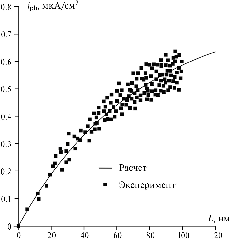 Здесь e = 1.6 × 10–19 Кл – заряд электрона, η – квантовый выход, Φ0 = P / (hνS) – интенсивность освещения, α – показатель поглощения света, L – толщина оксидной пленки, f – коэффициент, характеризующий разницу в скоростях процессов рекомбинации дырок и их потребления в электрохимической реакции на границе между фазой оксида и электролита, R – коэффициент отражения света от этой границы, iphmax – максимальный фототок, который достигается в пленке с толщиной, равной ширине ОПЗ.